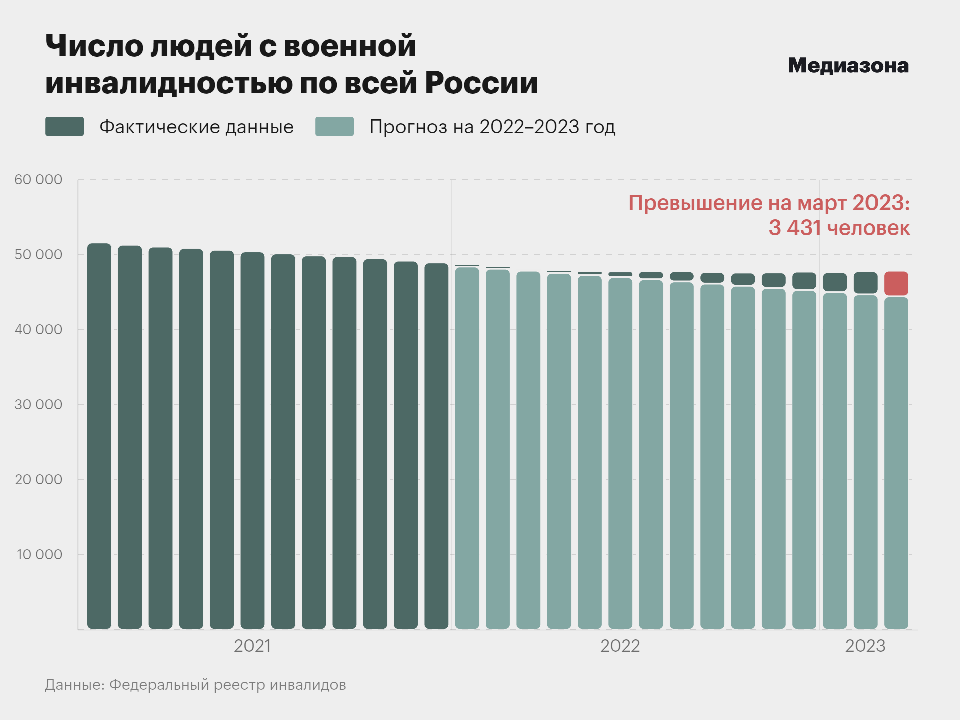 К началу 2022 года в России было около 49 тысяч военных инвалидов. В апреле их число перестало сокращаться, а в июле впервые вышло в плюс, то есть новых военных с инвалидностью появилось больше, чем скончалось ранее числящихся в реестре.