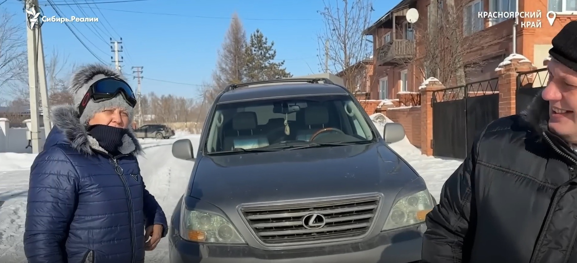 Пара, около 45–50 лет, рядом с внедорожником "Лексус", припаркованном у коттеджей: