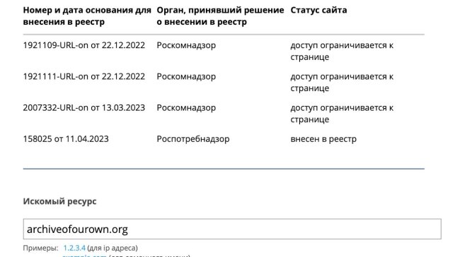 Роскомнадзор ограничил доступ к международной платформе для авторов и читателей фанфиков Archive of Our Own. Соответствующая информация отображается на сайте ведомства.