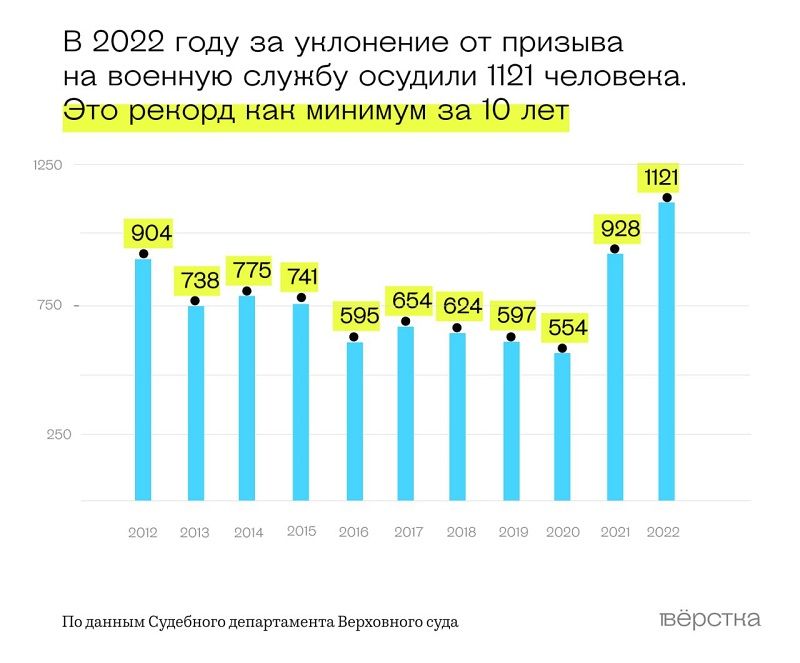 В 2022 году за уклонение от призыва на военную службу (часть 1 статьи 328 УК) осудили 1121 человека. Это рекорд как минимум за 10 лет, обратила внимание "Верстка".