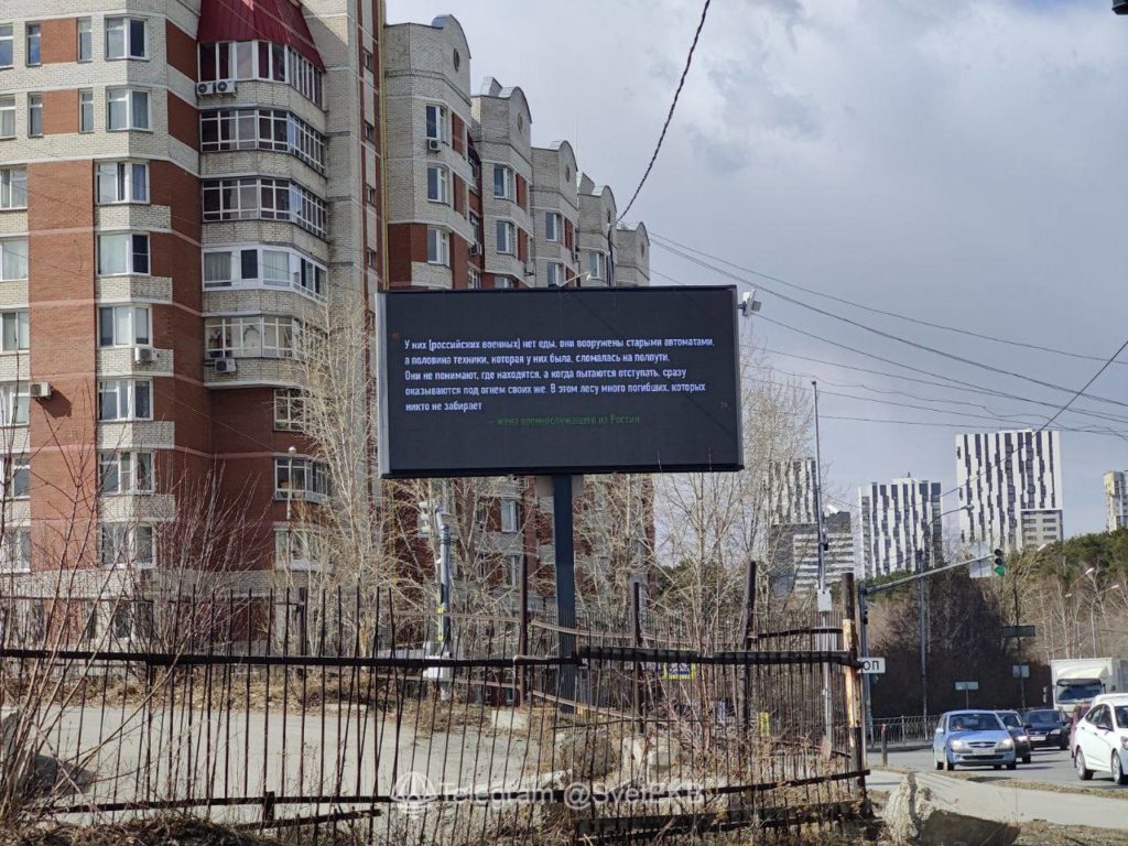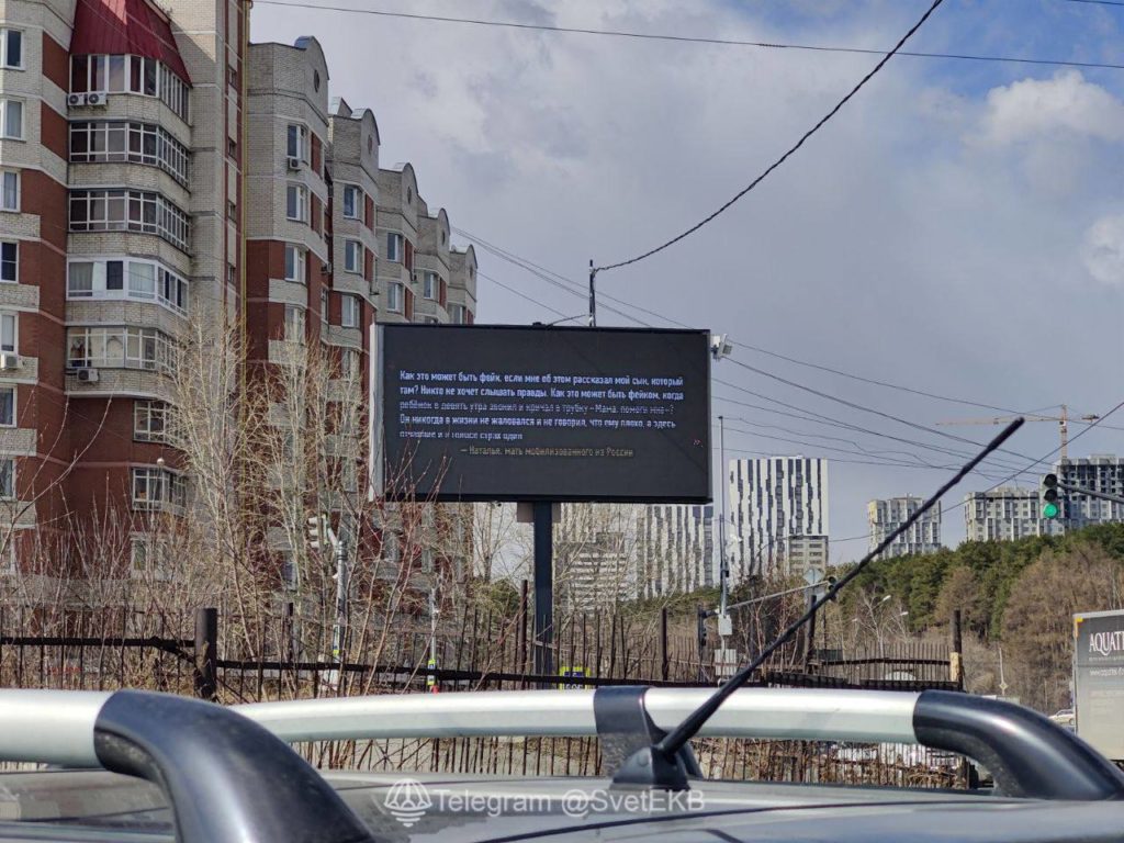На цифровом рекламном щите в Екатеринбурге и на экранах в ростовском ТЦ неизвестные разместили цитаты российских солдат и их родственников про войну в Украине. Фотографии из Екатеринбурга опубликовало издание It’s My City. В сообщениях на билбордах, в частности, говорилось, что мобилизованных в первый день отправили на штурм «как мясо». Кроме того, на щитах были сообщения о том, что у российских солдат нет еды и что они вооружены старой техникой.