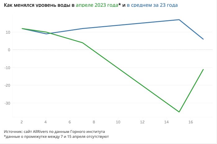 По данным Горного института, к 15 апреля уровень воды опустился на 39 сантиметров — 7 апреля он составлял 4 сантиметра. По сравнению со средним показателем за последние 23 года уровень опустился почти в 2,5 раза.