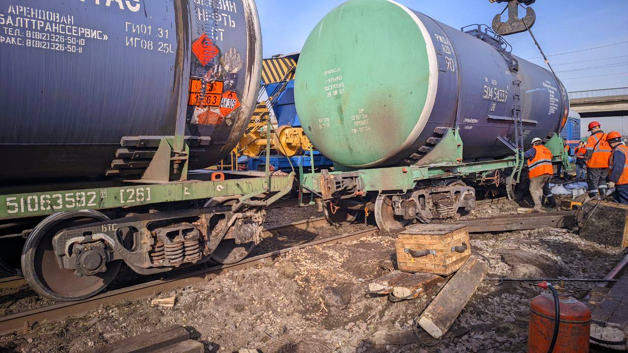 Что известно об аварии. Состав состоял из девяти вагонов, с рельсов сошли пять, но только две цистерны с авиационным топливом опрокинулись с рельсов на Сортировочной, пишет 78.ru.