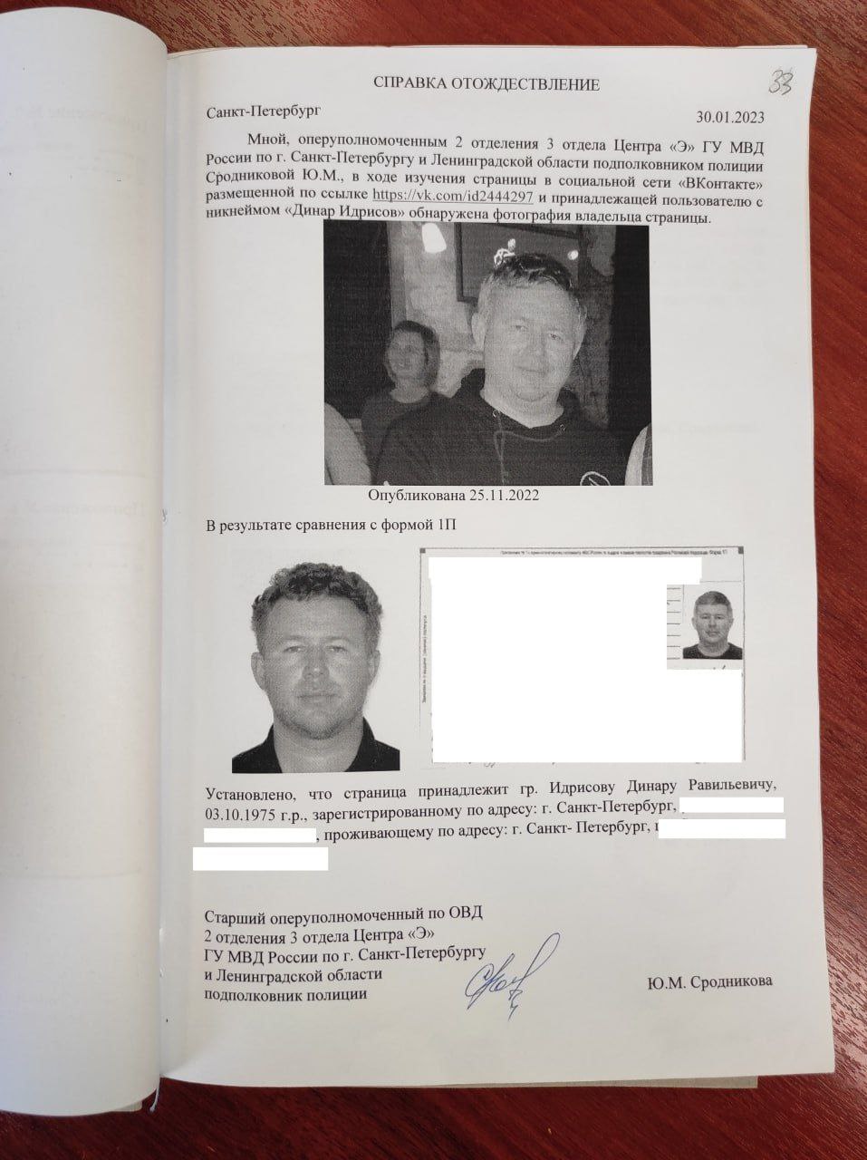Сотрудница центра «Э» Юлия Сродникова приложила к материалам акт осмотра страницы Идрисова во «ВКонтакте». Документ датирован 30 января 2023 года. Однако правозащитник заявил, что на самом деле силовики провели осмотр 2 декабря 2022 года.