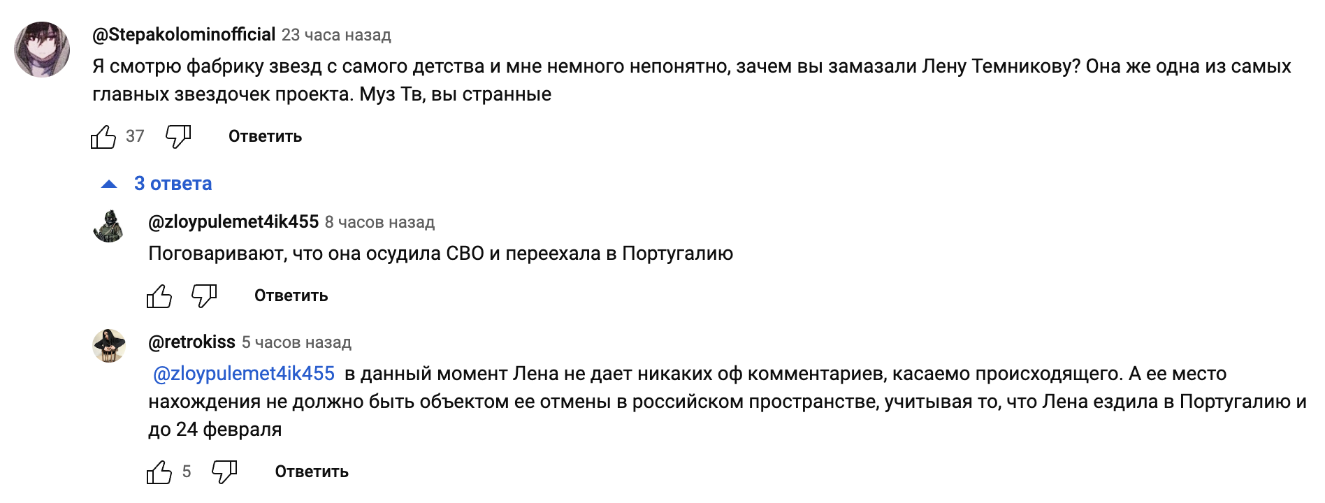 Телеканал «Муз-ТВ» выпустил документальный фильм об участниках шоу «Фабрика звезд» разных лет, зрители заметили, что монтажеры заблюрили певицу Елену Темникову, высказывавшуюся против войны. Фильм «Золотая клетка для артистов! История шоу "Фабрика звезд"» опубликован на YouTube.