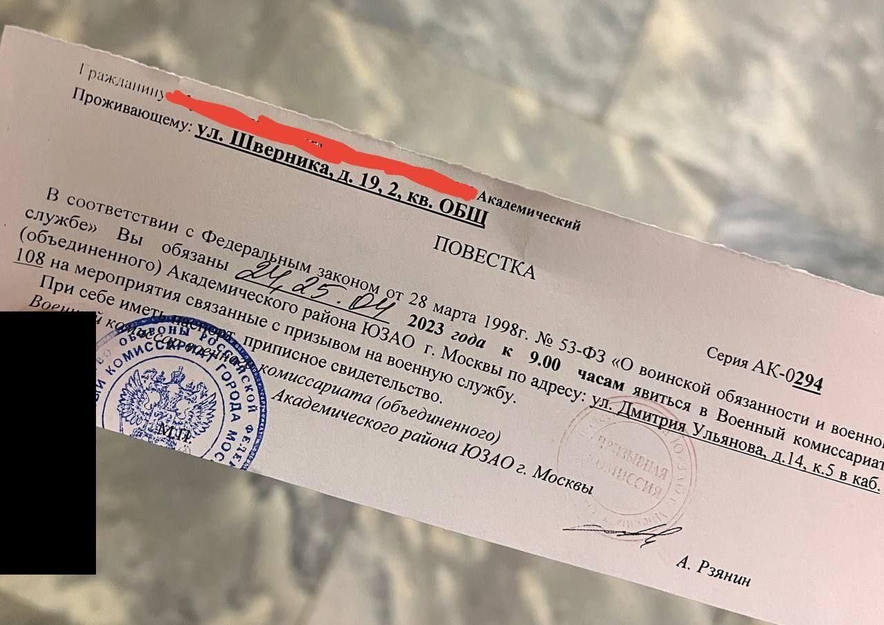 Студент_ки МГУ сообщили DOXA, что в общежитии ДАС МГУ на юго-западе Москвы раздают повестки. О раздаче призывных повесток комендант_ками общежития сообщили также читатель_ницы телеграм-каналов «Протестный МГУ» и «Первый университетский».