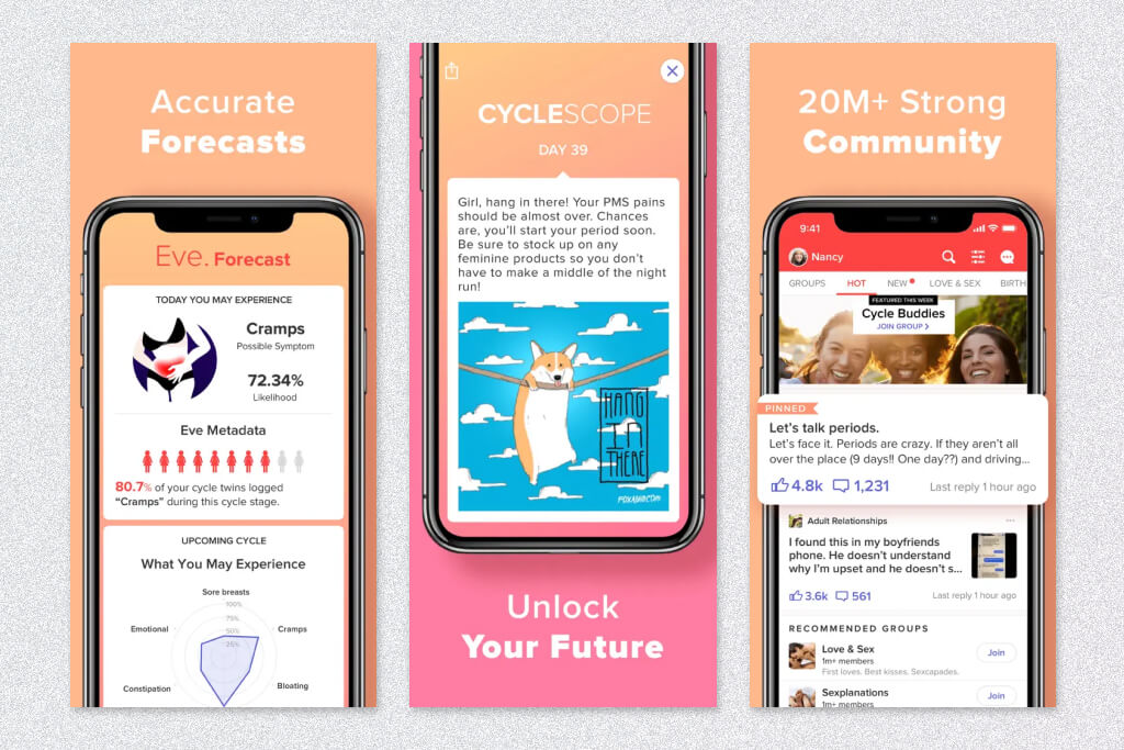 Приложение из линейки, предназначенной для помощи женщинам на разных этапах — от отслеживания менструации до планирования беременности и первых месяцев с ребенком. Eve помогает наблюдать за менструальным циклом, отмечать физиологические и эмоциональные перемены, следить за овуляцией.