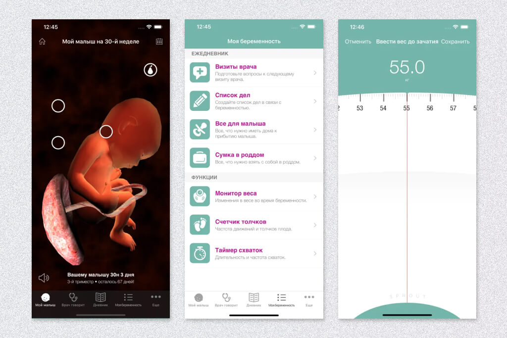Sprout дает подробную метрику о здоровье женщины и ребенка, позволяет отмечать симптомы и показывает очень реалистичную 3D-модель развития плода.