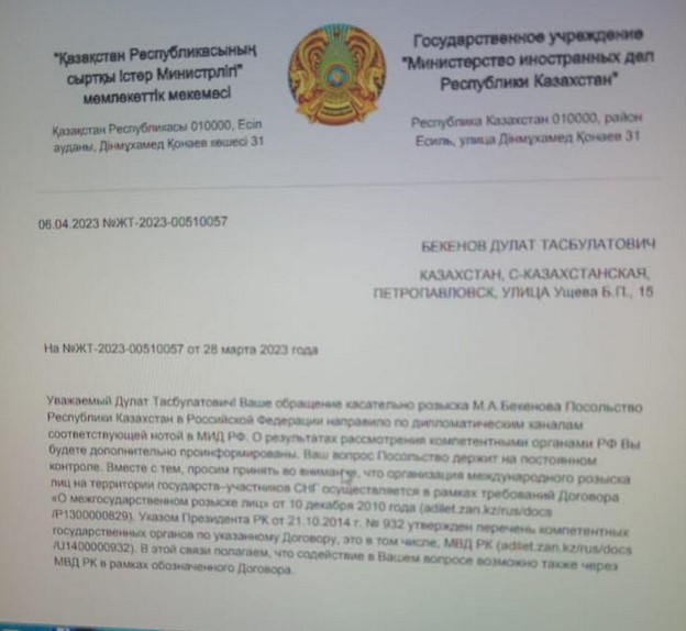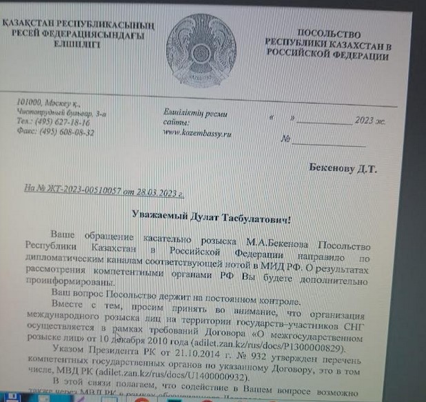 По сведениям, он находится в п. Молькино Краснодарского края РФ на базе подготовки Частной военной компании "Вагнер". Прошу оказать помощь и содействие в розыске и возвращении его на Родину в Республику Казахстан".