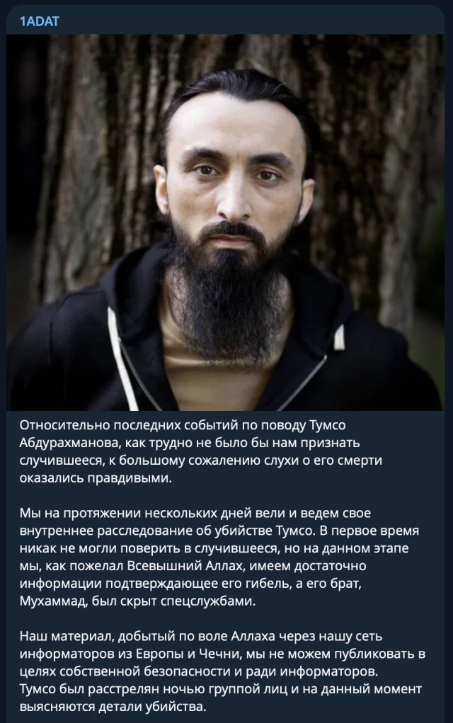 «Относительно последних событий по поводу Тумсо Абдурахманова, как трудно не было бы нам признать случившееся, к большому сожалению слухи о его смерти оказались правдивыми.Мы на протяжении нескольких дней вели и ведем свое внутреннее расследование об убийстве Тумсо. В первое время никак не могли поверить в случившееся, но на данном этапе мы, как пожелал Всевышний Аллах, имеем достаточно информации подтверждающее его гибель, а его брат, Мухаммад, был скрыт спецслужбами.