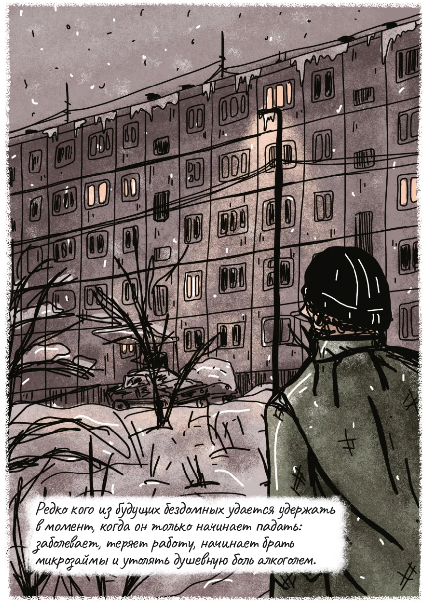 Пока я искала ответ на этот вопрос, узнала много такого, что изменило мое представление о бездомности. И, как мне кажется, я нашла ответ. Если коротко, мне тогда очень понравилось, как этот ответ сформулировал волонтер «Ночлежки» Игорь Антонов. Он сказал, что «редко кого удается поймать за шкирку в момент, когда он только начинает скатываться: заболевает, теряет работу, начинает брать микрозаймы и утолять душевную боль алкоголем. И крайне сложно помочь выбраться тому, кто длительное время уже пожил на улице. Человек сильно меняется там. Но мы этого не видим и продолжаем подходить к этим людям с нашей привычной «домашней» меркой нормальности».