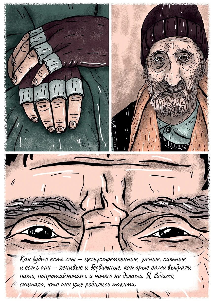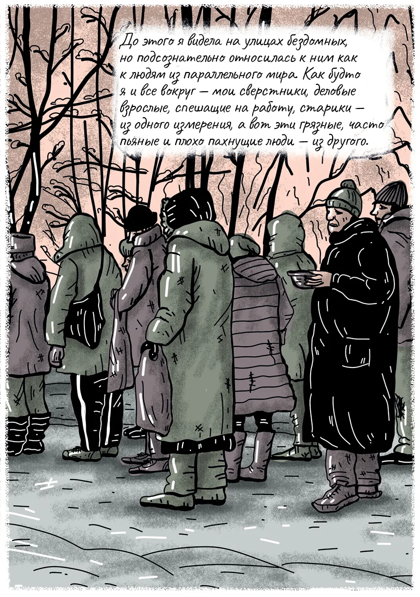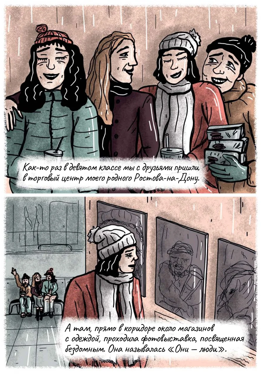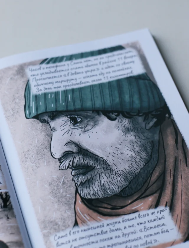 Вскоре к нам с Альбиной обратилось издательство «КомпасГид» и предложило нам выпустить графический репортаж на основе моих материалов о бездомных и ее иллюстраций. В издательстве верят, что наша работа поможет сформировать человечное отношение к бездомным у детей, которые только начинают задумываться о том, как в нашем мире все устроено. Мы с Альбиной согласились. Так появился на свет наш комикс «Уличные люди».