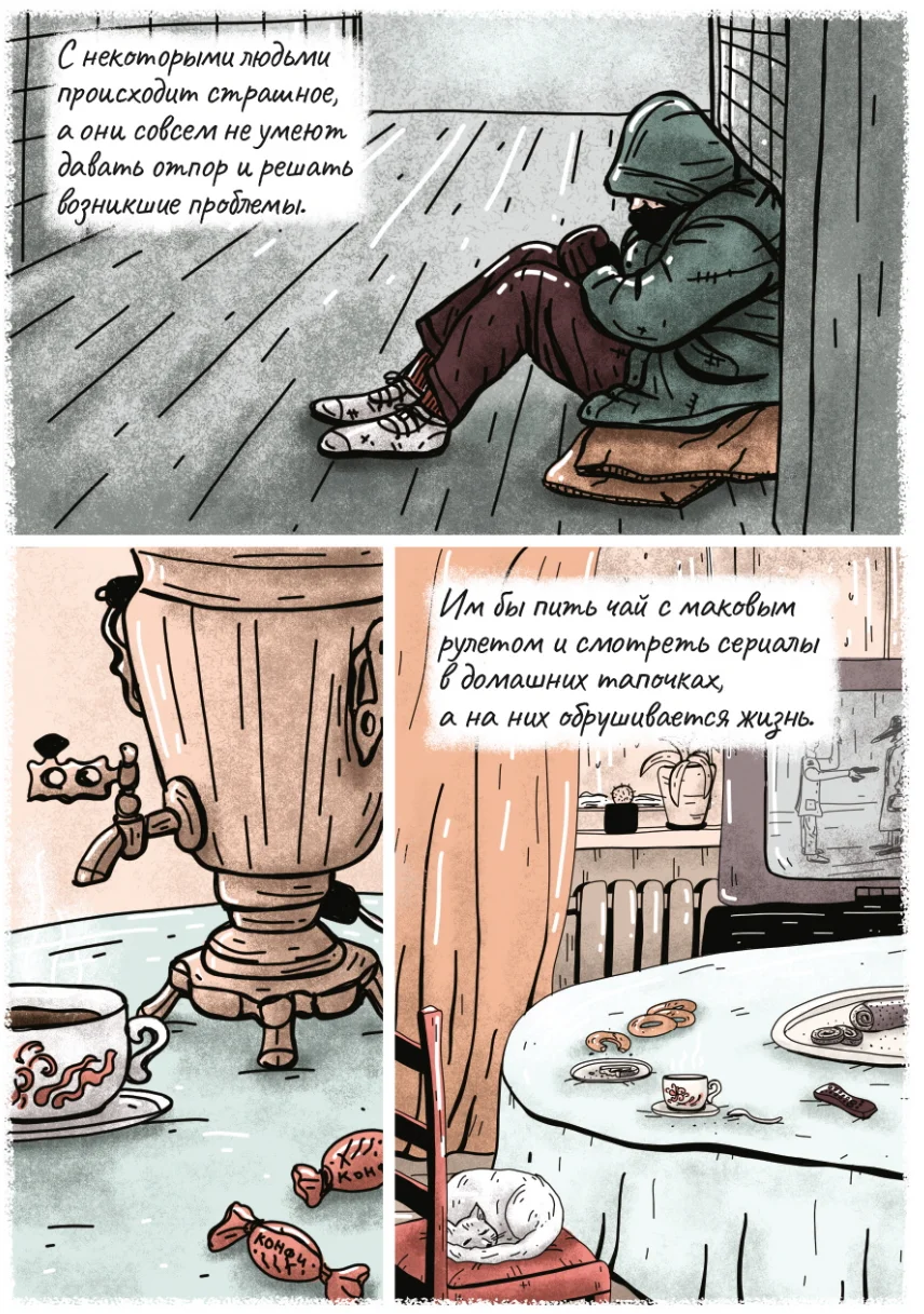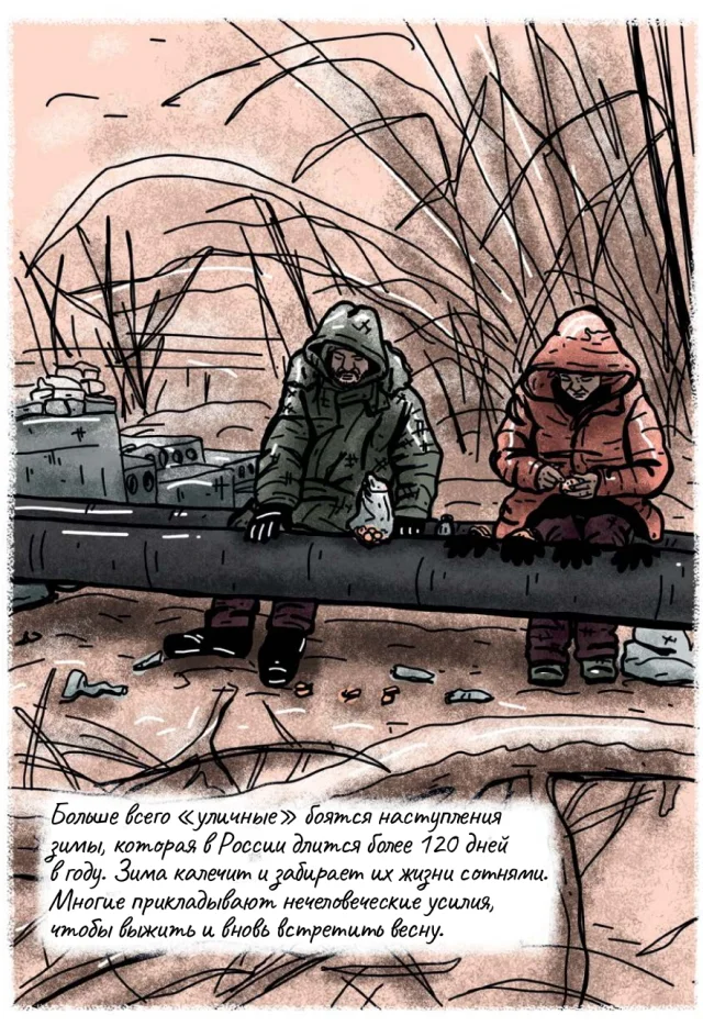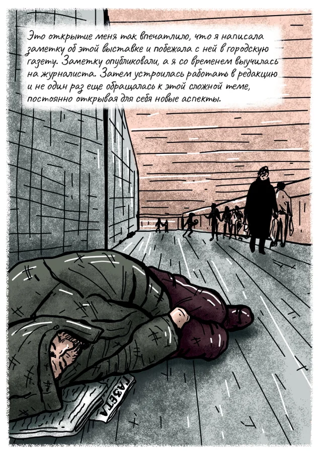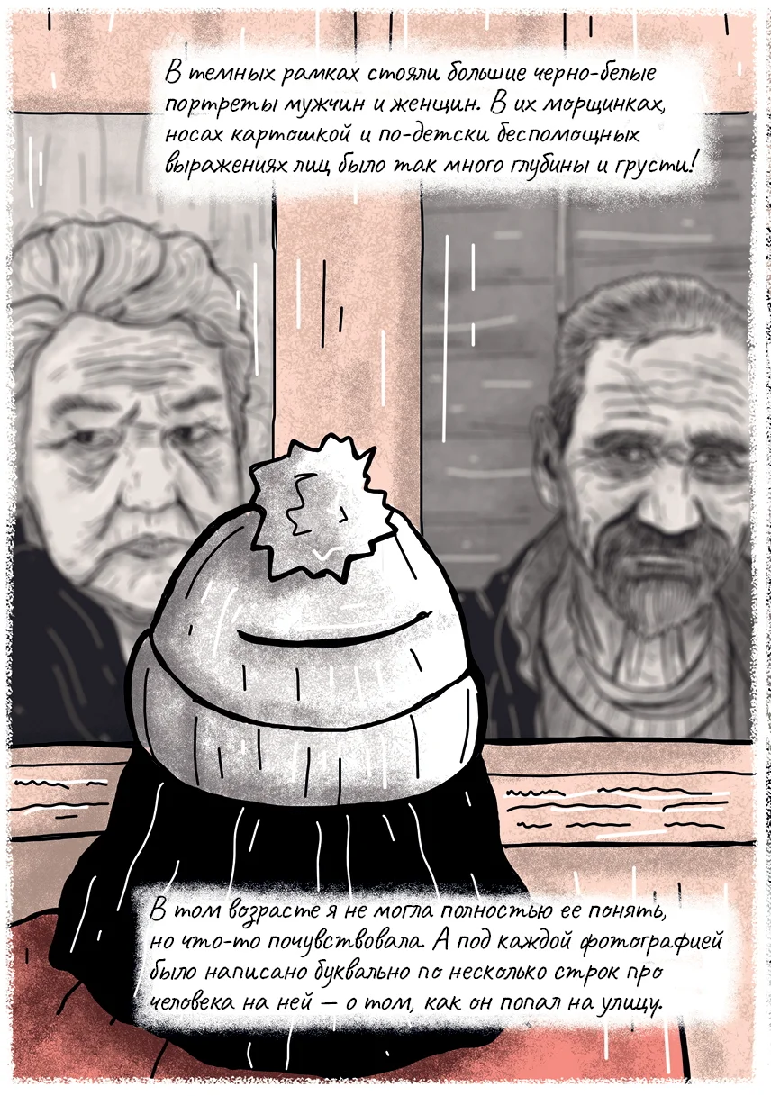 Вскоре к нам с Альбиной обратилось издательство «КомпасГид» и предложило нам выпустить графический репортаж на основе моих материалов о бездомных и ее иллюстраций. В издательстве верят, что наша работа поможет сформировать человечное отношение к бездомным у детей, которые только начинают задумываться о том, как в нашем мире все устроено. Мы с Альбиной согласились. Так появился на свет наш комикс «Уличные люди».