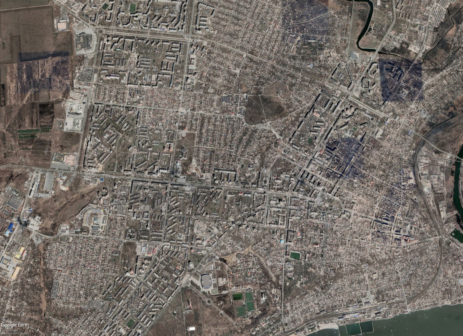 On April 25, Google Earth and Google Maps updated their satellite images of Mariupol. The previous satellite images were from June 2021, before Russia’s full-scale invasion of Ukraine. The new photographs were taken at different times following the start of the war, which is why fires are visible in some parts of the city, while in other areas occupying authorities are seen constructing new buildings. What’s more, one newly reconstructed area of Mariupol, which Vladimir Putin visited in March 2023, isn’t visible at all. The following photographs from Google Earth offer a glimpse at the extent of the destruction inflicted upon Mariupol since the start of the Russian invasion.