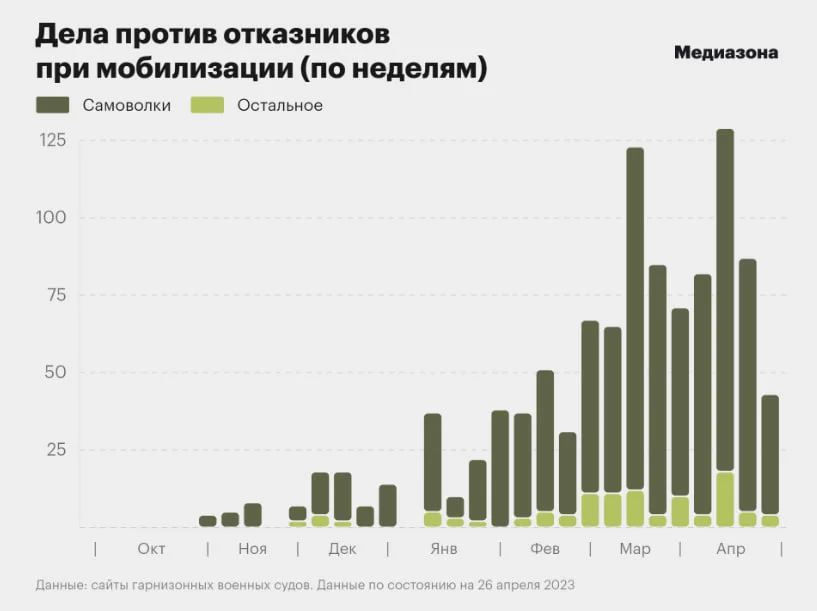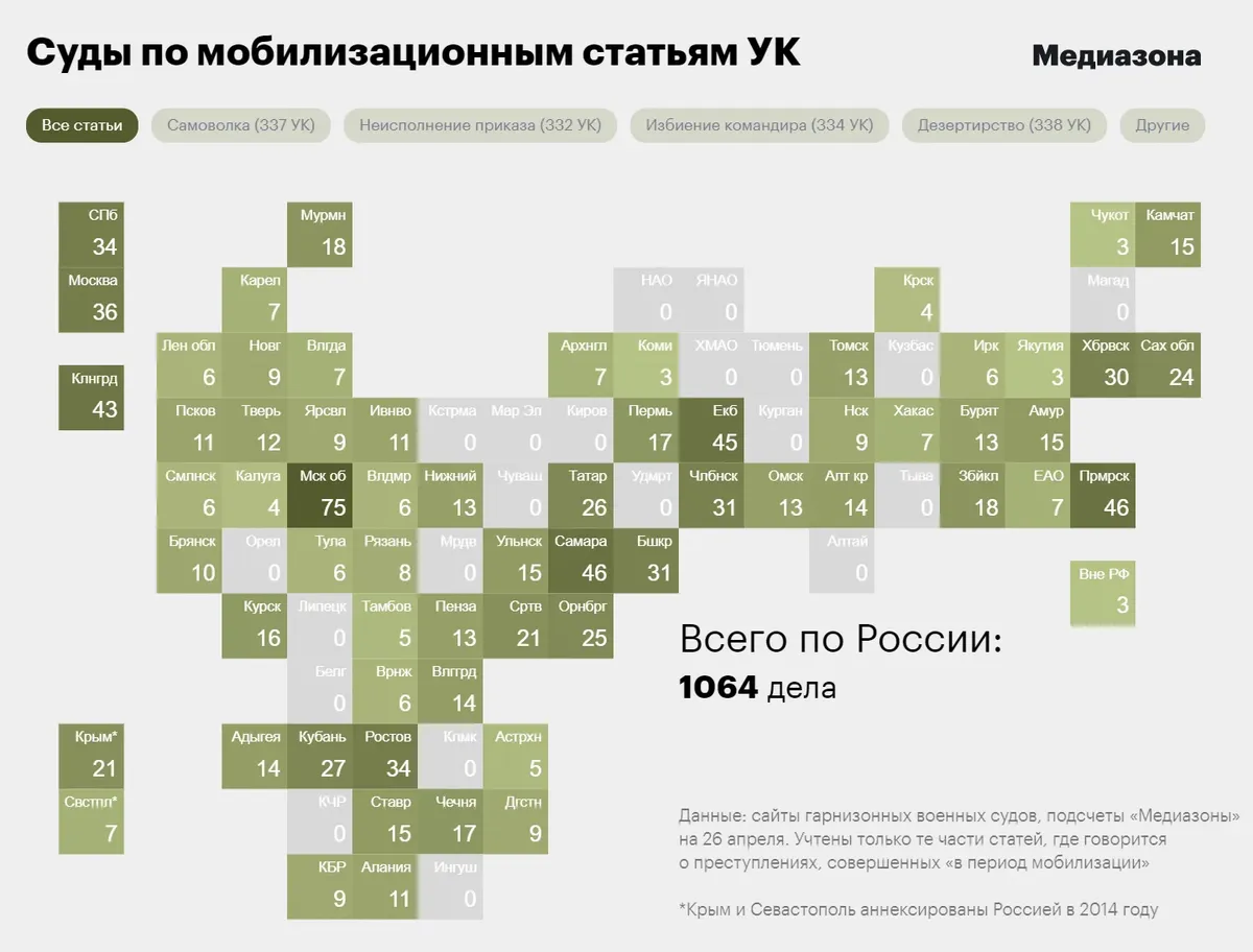 По подсчетам издания, к последней неделе апреля в гарнизонные военные суды поступило 1064 дела. Подавляющее большинство дел (89% или 951 дело) возбуждено по статье о самовольном оставлении части во время мобилизации. По 586 делам уже вынесены решения. На втором месте (5% или 52 дела) — протоколы о неисполнении приказа во время мобилизации.