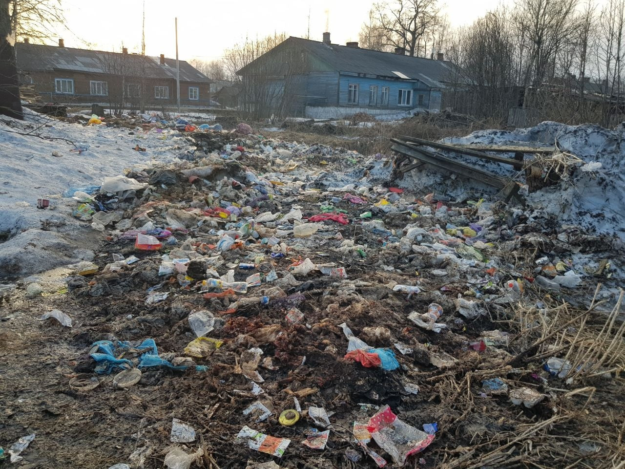 Вот за этой прекрасной кучей мусора расположены дома исторического квартала, которые были отремонтированы в прошлом году за 65 млн рублей. А происходит все это в Архангельской области, Няндомском муниципальном округе.