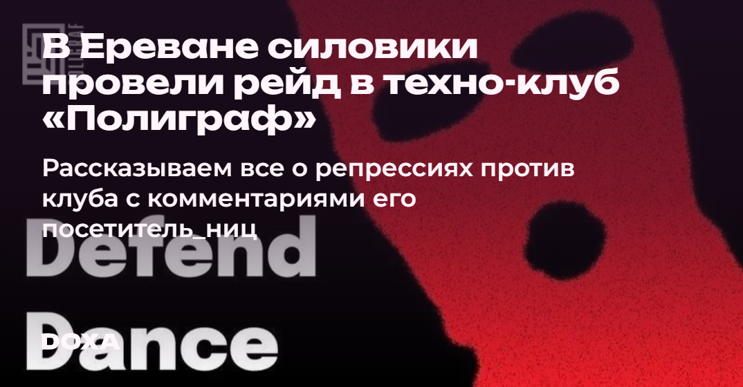 В ночь на 23 апреля армянская полиция ворвались в ереванский техно-клуб «Полиграф». Силовики избили работни_ц и посетитель_ниц клуба, обыскали их, а позже некоторых увезли в полицейский участок «против своей воли».