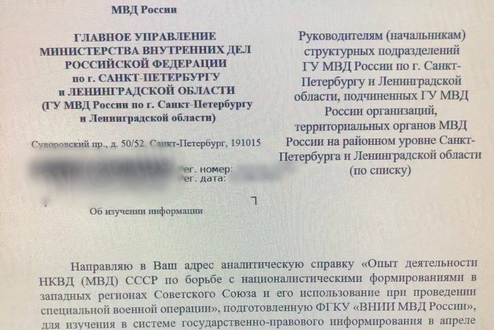 Главам подразделений полиции в Петербурге отправили аналитическую справку о борьбе НКВД с националистами в западных регионах СССР. Об этом сообщила «Фонтанка» без ссылки на источник.
