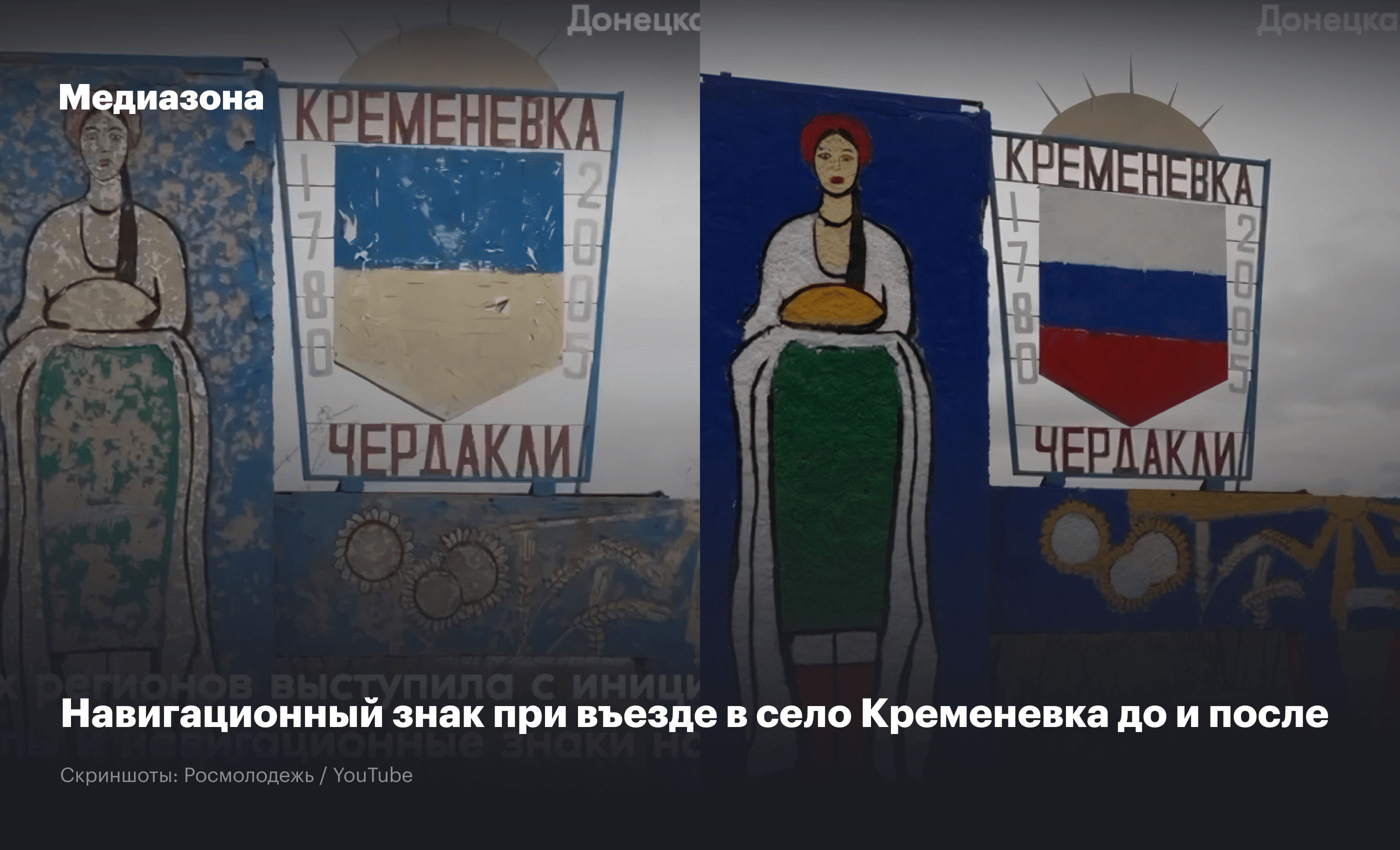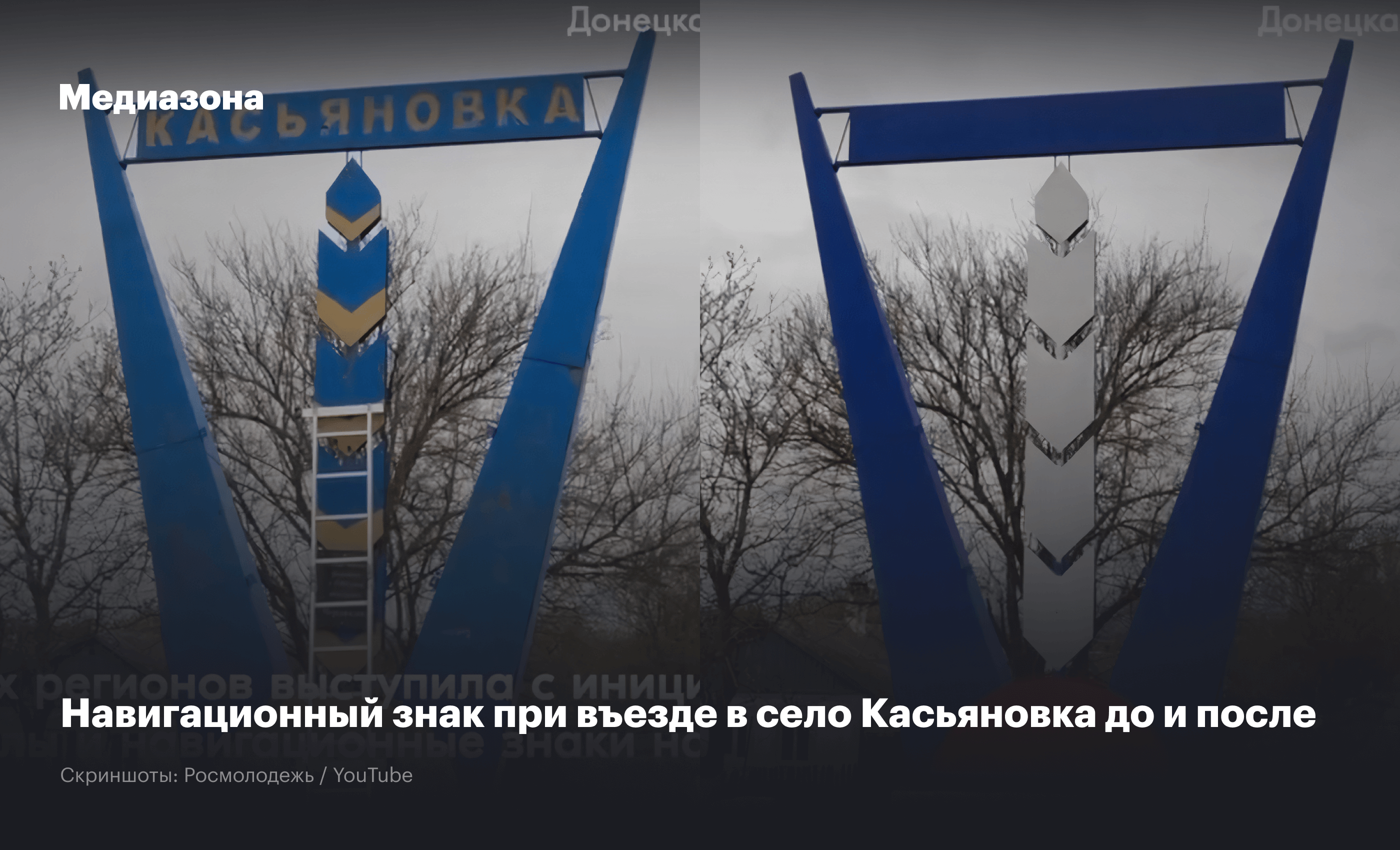 В Донецкой, Луганской и Запарожской областях молодые люди перекрасили стелы, остановки и навигационные знаки на въездах в населенные пункты в цвета российского флага. Ролик об этом опубликовала глава Росмолодежи Ксения Разуваева.