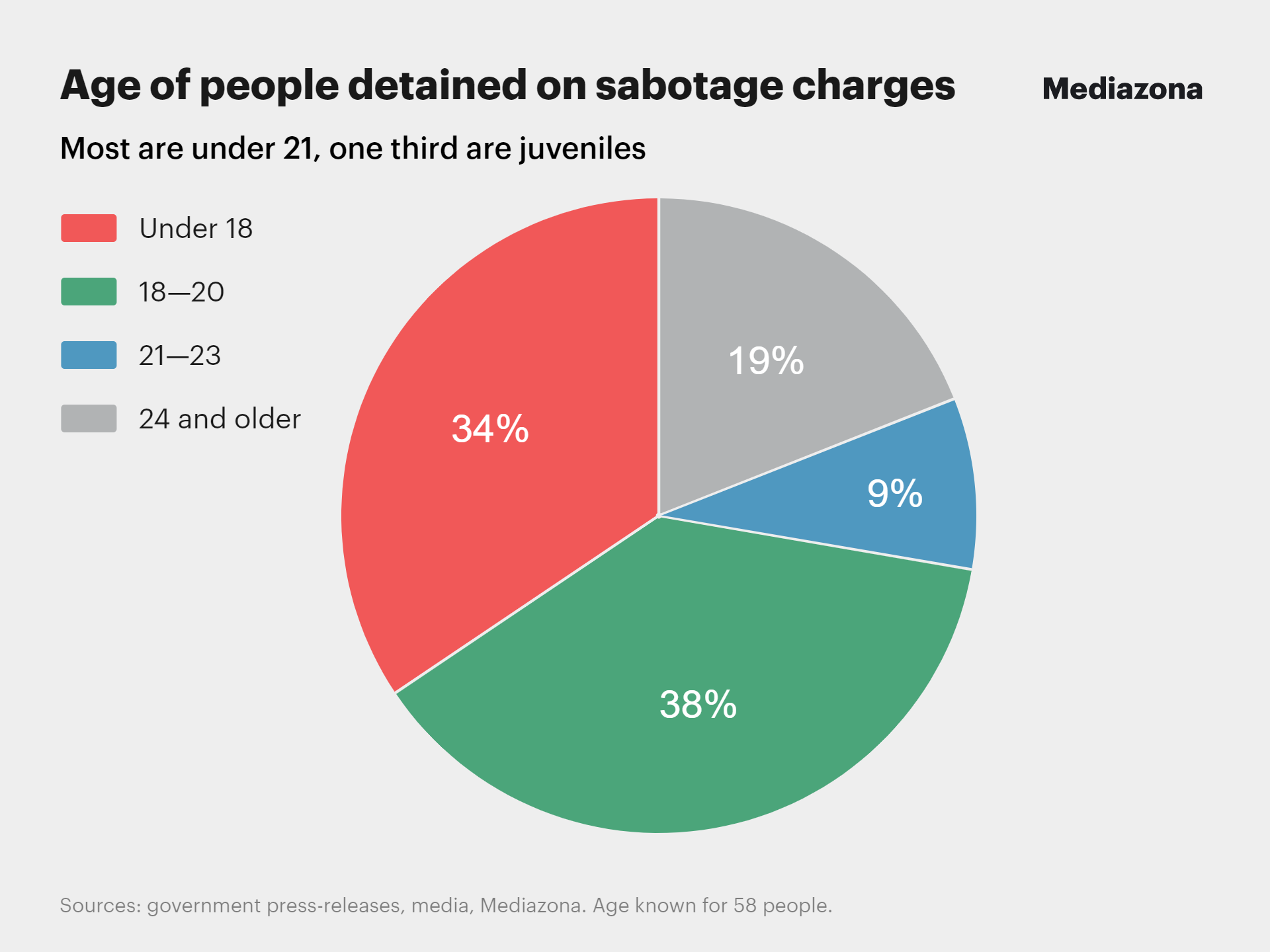 The approximate ages of 58 of the 66 detainees are known: a third of them are minors (20), while the rest are also quite young (25 individuals aged between 18 and 21), with only eight people over the age of 30.