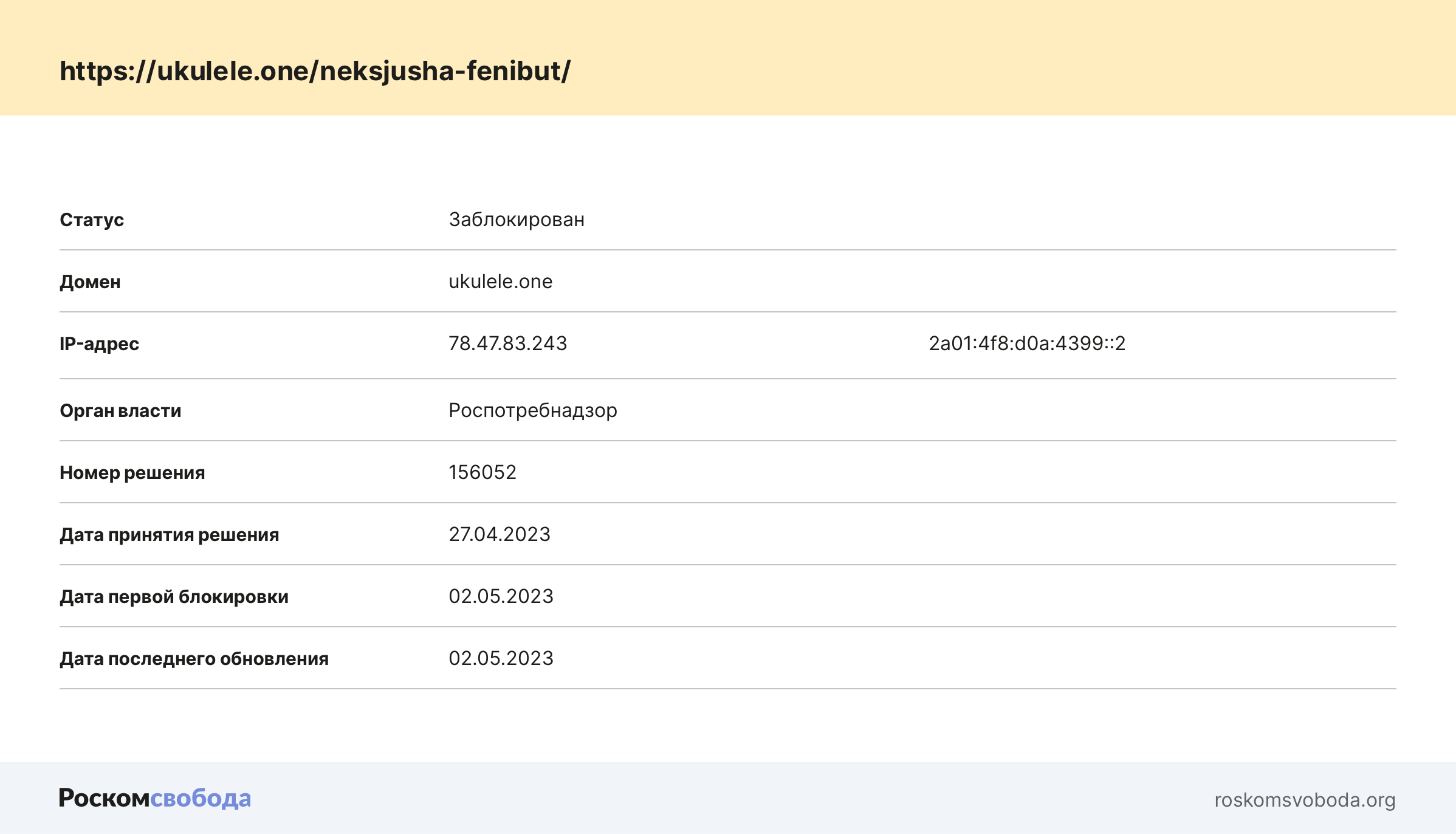 В карточке указан целый список сайтов, включая Genius и YouTube, где находились клипы и ссылки на тексты песни Нексюши, и городской прокурор требовал ограничить к ним доступ. Но в реестр запрещённой информации в итоге летом 2021 года попала только ссылка с Muzclub, и через год она была оттуда вынесена.