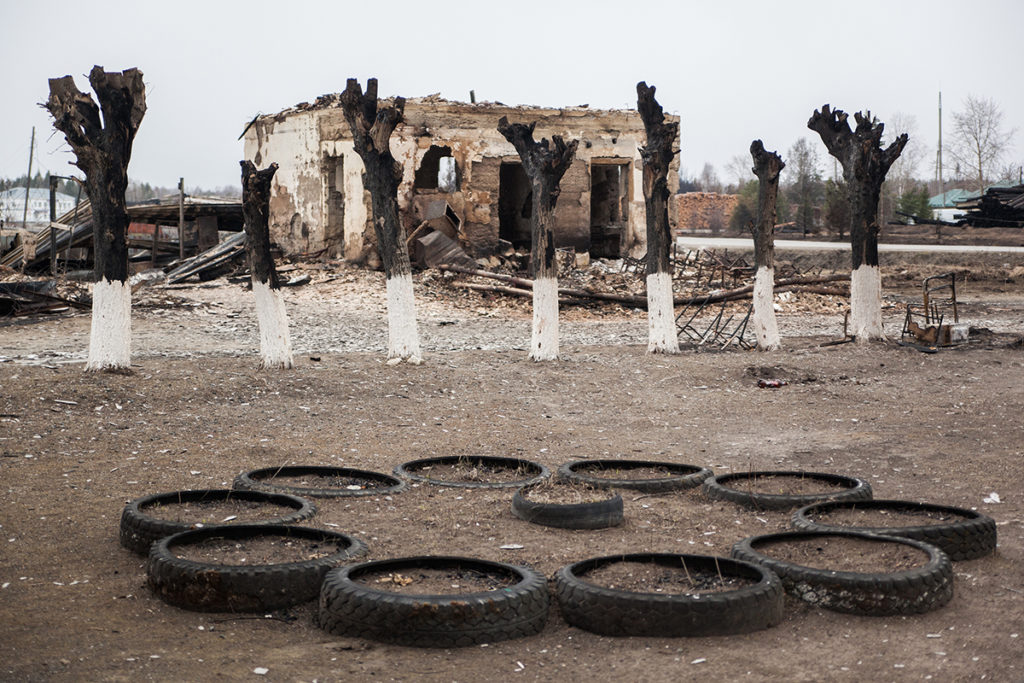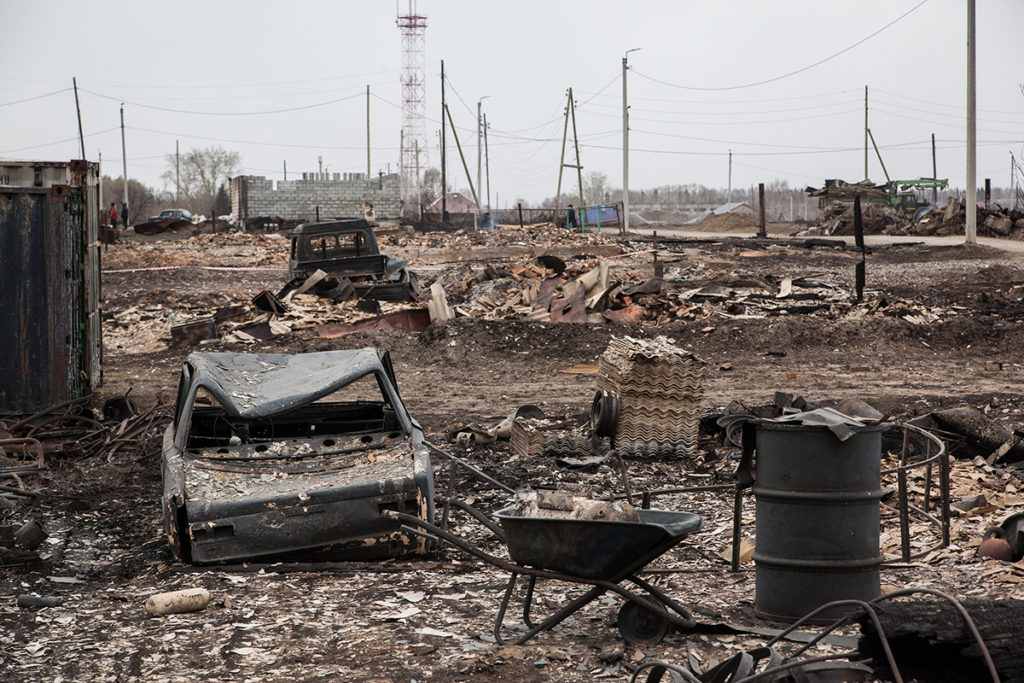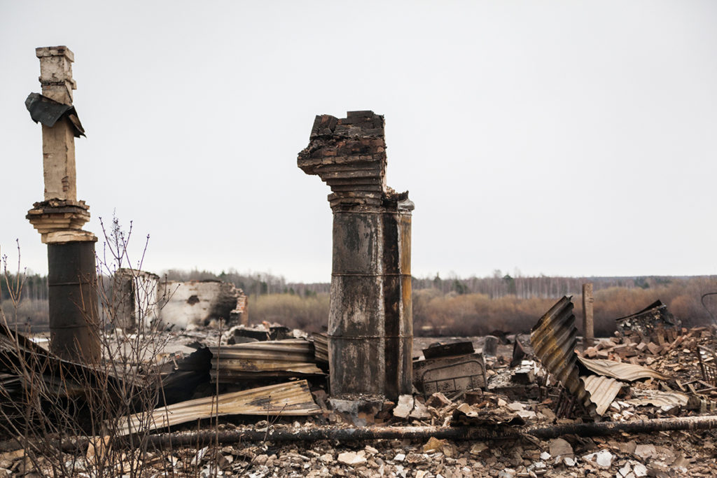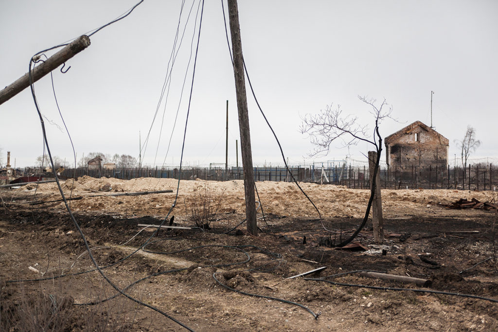 Посреди пепелищ торчат голландские печи. 30 апреля грейдеры ровняли с землей то, что осталось от домов, сараев и бань. Люди — те, до кого техника еще не дошла — бродили по своим участкам, внимательно всматриваясь в выжженную почву, надеясь найти что-то случайно уцелевшее. Земля все еще тлела, шел дым. От гари резало глаза.