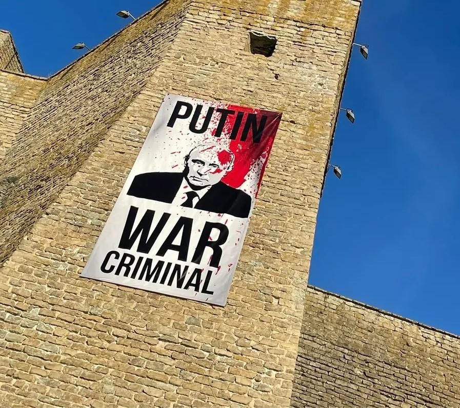 В Эстонии Музей Narva Muuseum и объединение по борьбе с пропагандой Propastop вывесили на Нарвском замке вывесили плакат с надписью «Путин — военный преступник».