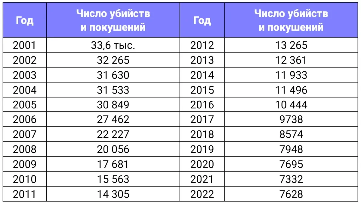 В России с 2002 по 2021 год происходило устойчивое и постепенное сокращение числа зарегистрированных убийств и покушений на убийство. Однако данные о числе убийств и покушений на убийство, зарегистрированных в 2022 году, свидетельствуют о росте этого вида преступности впервые за последние двадцать лет. Согласно статистике МВД, в 2022 году в России зарегистрировано 7628 убийств и покушений — на 4% больше, чем в 2021-м.