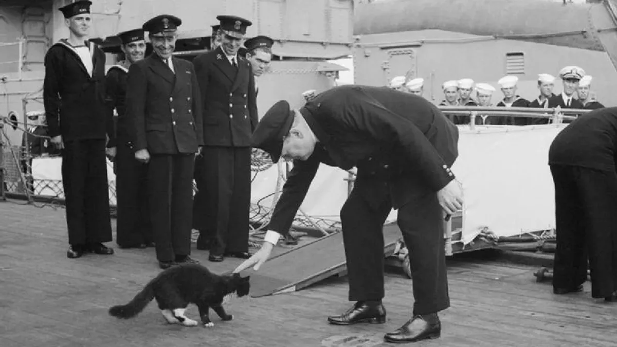 Премьер-министр Великобритании У. Черчилль гладит корабельного кота Блэки на палубе английского линкора «Принц оф Уэйлс». Фото: архив