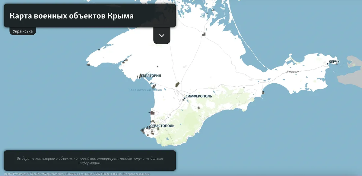 Собранные военные объекты разделены на десять категорий с геолокациями. Их можно увидеть на спутниковых снимках Planet Labs и собранных фото.