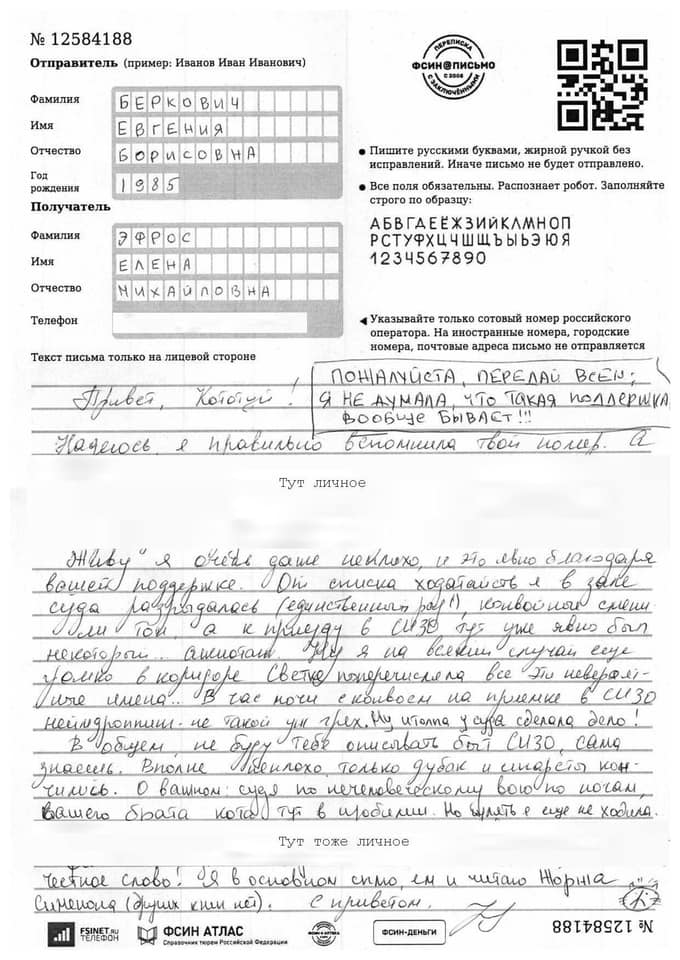 Режиссерка Женя Беркович, арестованная по делу об «оправдании терроризма», которое возбудили из спектакля «Финист Ясный Сокол», передала письмо из СИЗО. Его опубликовала продюсерка, основательница портала W-O-S Екатерина Хорикова.