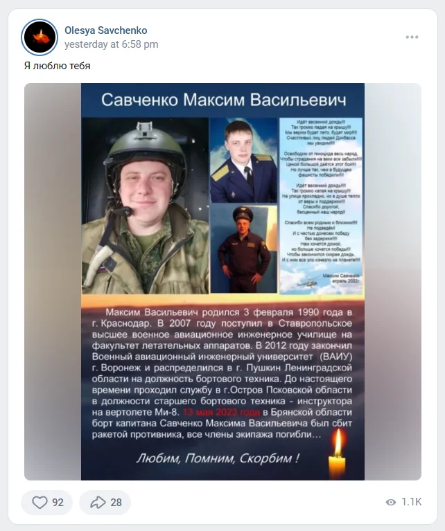 Она опубликовала на своей странице «ВКонтакте» пост, в котором говорилось, что ее муж, Максим Савченко, проходил службу в городе Остров Псковской области в должности старшего бортового техника — инструктора на вертолете.