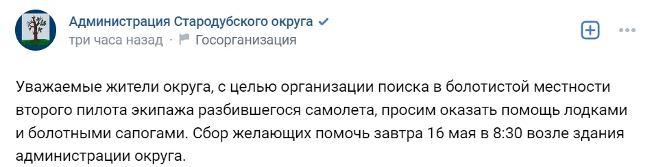 «Уважаемые жители округа, с целью организации поиска в болотистой местности второго пилота экипажа разбившегося самолета, просим оказать помощь лодками и болотными сапогами», — говорится в посте.