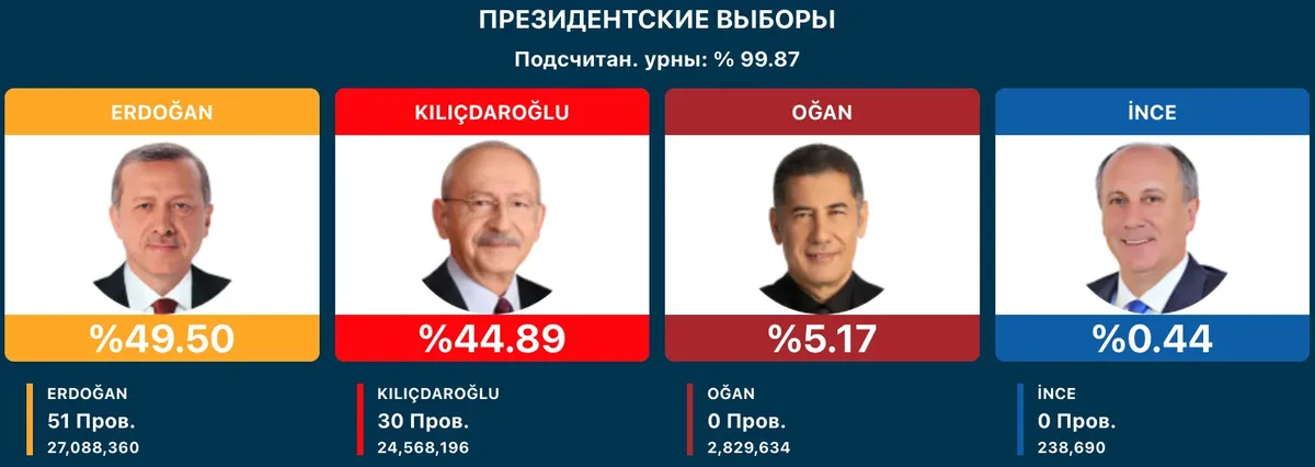 Эрдоган сейчас не смог выиграть в первом туре, получив 49,5%, ему не хватило около 300 тысяч голосов для победы.