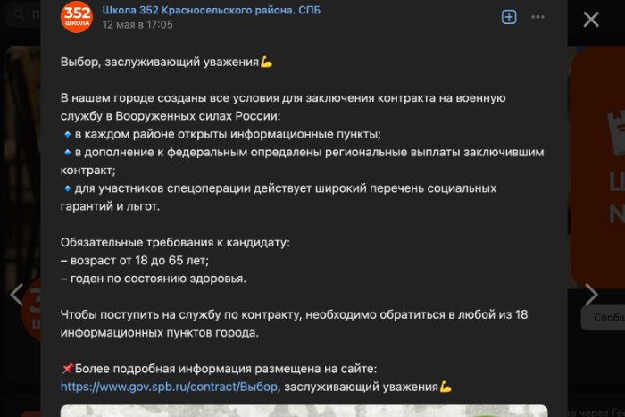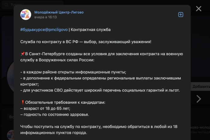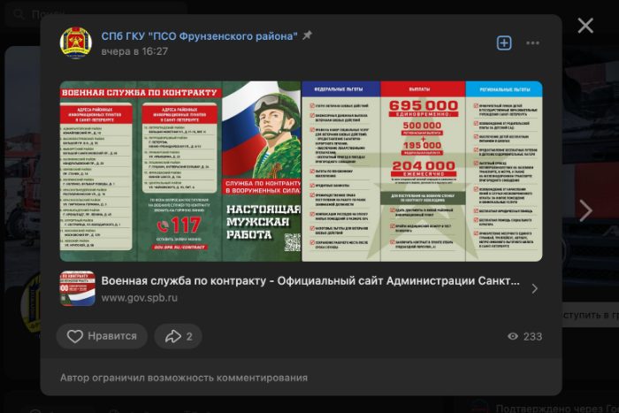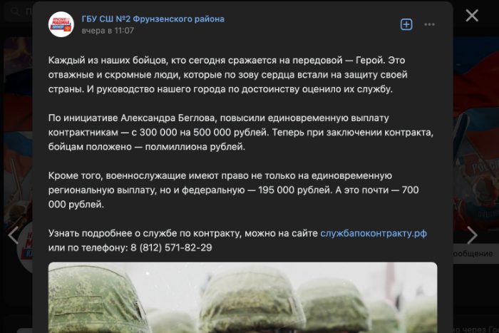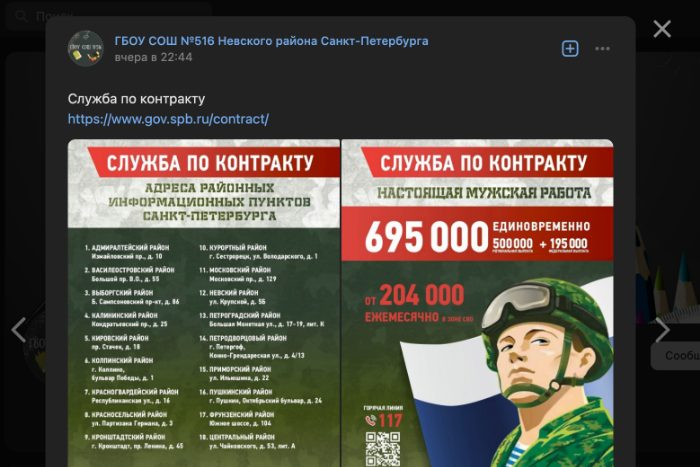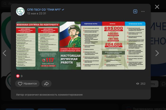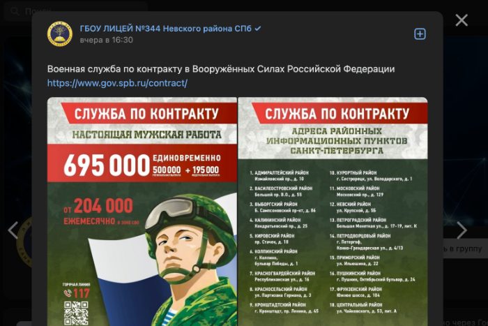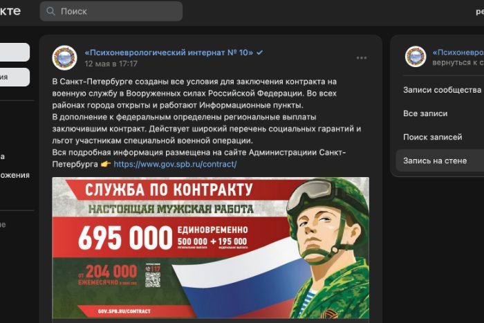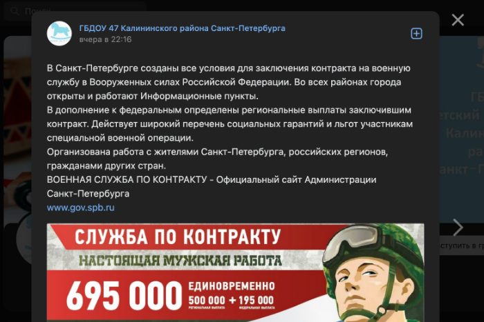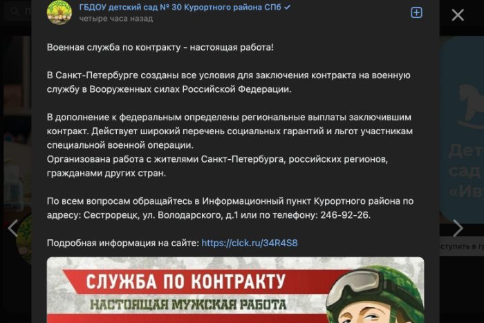 Во вторник, 16 мая, в пабликах во «ВКонтакте» массово опубликовали посты с рекламой военной службы по контракту, обнаружила «Бумага». Подобные публикации появились в группах трех детских садов, трех школ, двух психоневрологических интернатов, молодежной центре и пожарной части.