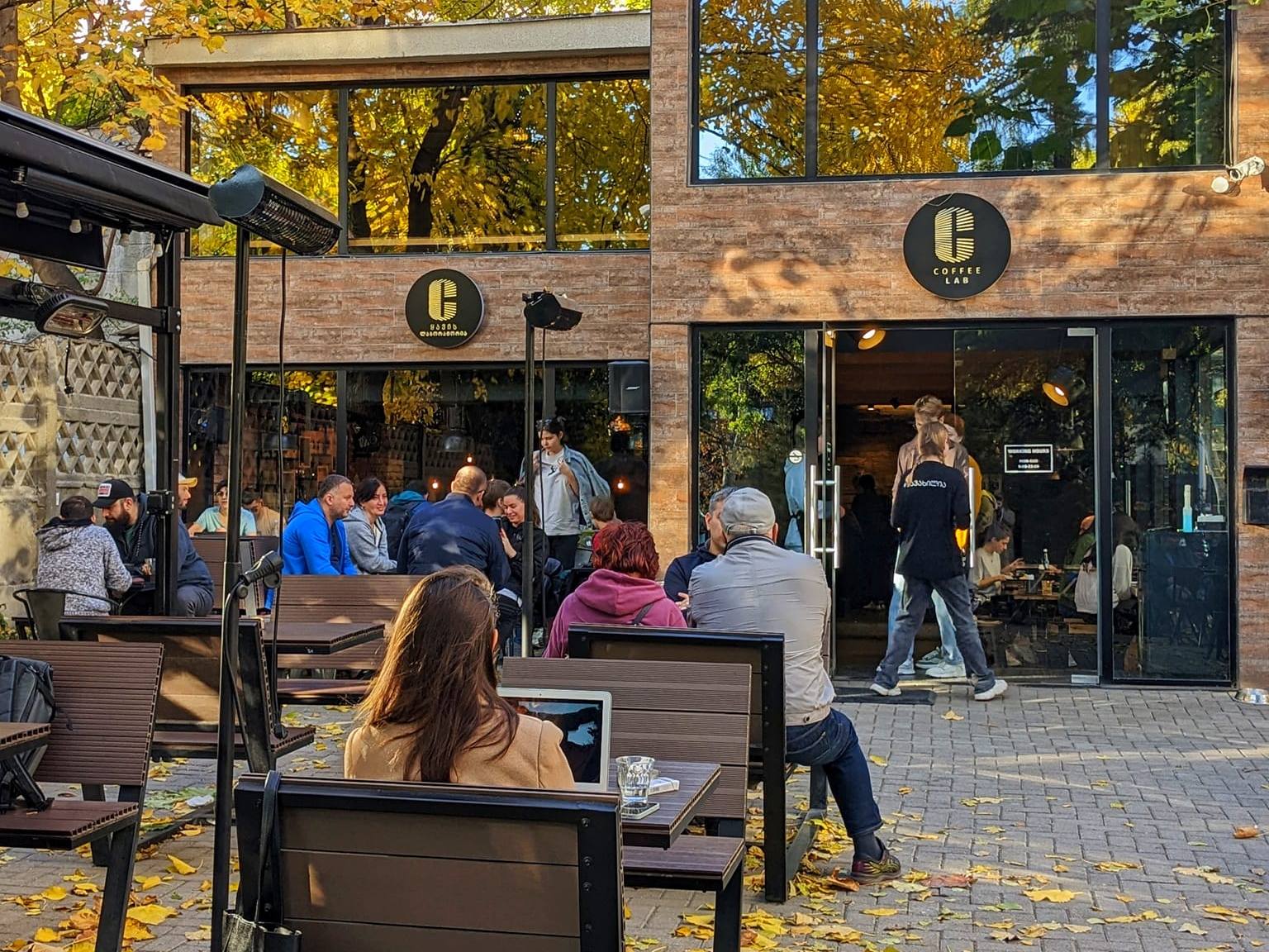 Coffee lab — это грузинская компания — обжарщик кофе и сеть кофеен. Кафе в Сабуртало расположено напротив так называемого Красного сада Васо Годзиашвили. Столики на улице находятся далеко от дороги. Это тоже дог-френдли-место.