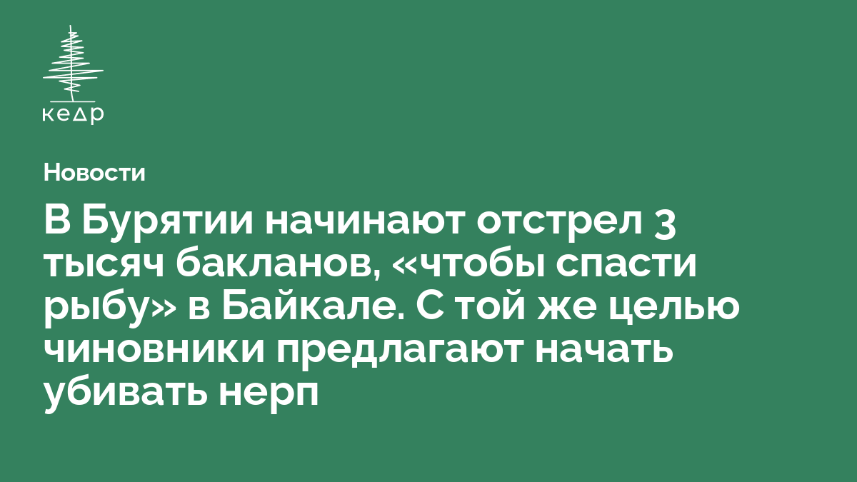 Ранее «Кедр» писал о том, что бурятские депутаты предложили убивать большого баклана, чтобы «спасти рыбу» в Байкале. По их мнению, птица «ежегодно поедает до тысячи тонн ценного и охраняемого байкальского омуля», препятствуя его размножению. Рост популяции этой рыбы — одна из задач национального проекта «Экология».
