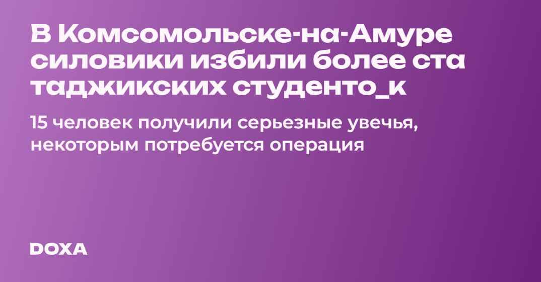 Утром 19 мая в Комсомольске-на-Амуре Хабаровского края местные омоновцы пришли в общежитие КнАГУ и избили более ста граждан_ок Таджикистана, собиравшихся на занятия. Об этом сообщает «Радио Озоди».