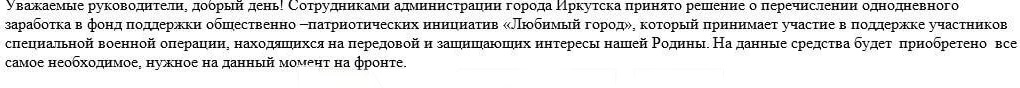 – Нам в "Водоканале" такие заявления еще с осени раздают. Знаю от сестры, что в поликлиниках Иркутска то же самое. О том, что всю мэрию обязывают "скидываться на СВО", чуть ли не в открыто пишут-хвастают сами чиновники в телеграм-канале "патриотических инициатив" Иркутска. Ну, они, конечно, пишут, что это все исключительно добровольно. Только вот моя бывшая коллега, которая там работает, призналась, что кулуарно к каждому подошли-намекнули: "Не напишешь заявление о переводе – будешь писать об увольнении". Понятно, что всякие есть, и добровольно тоже понесли, но не 100% же, согласитесь? – говорит работник муниципального предприятия Сергей.