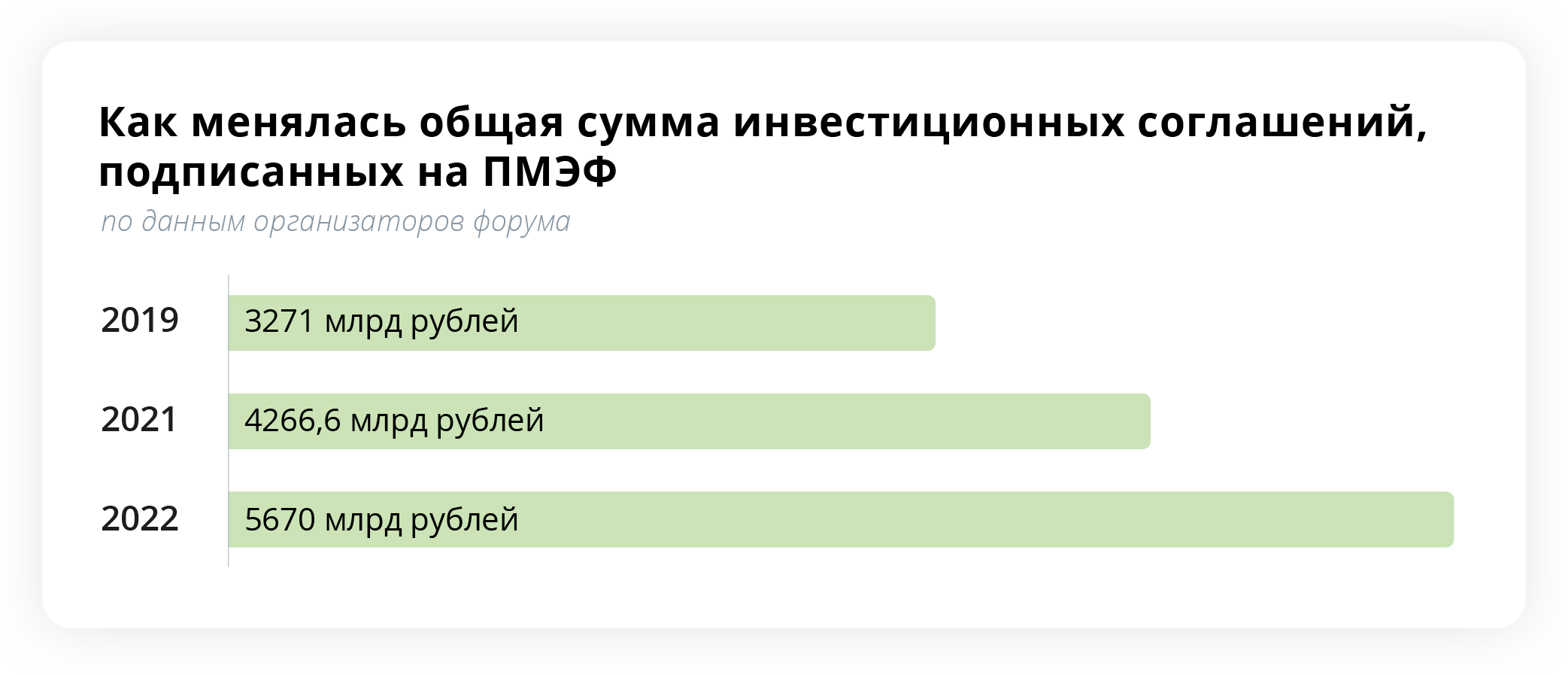 Рост наблюдается как в рублевом, так и в долларовом эквиваленте. Если пересчитать рублевые показатели в американскую валюту, окажется, что в 2019 году общая сумма контрактов составила 50 миллиардов, а в 2021-м — уже 58 миллиардов долларов. Прошлым летом этот показатель установил новый рекорд — участники ПМЭФ подписали соглашения почти на 100 миллиардов долларов.
