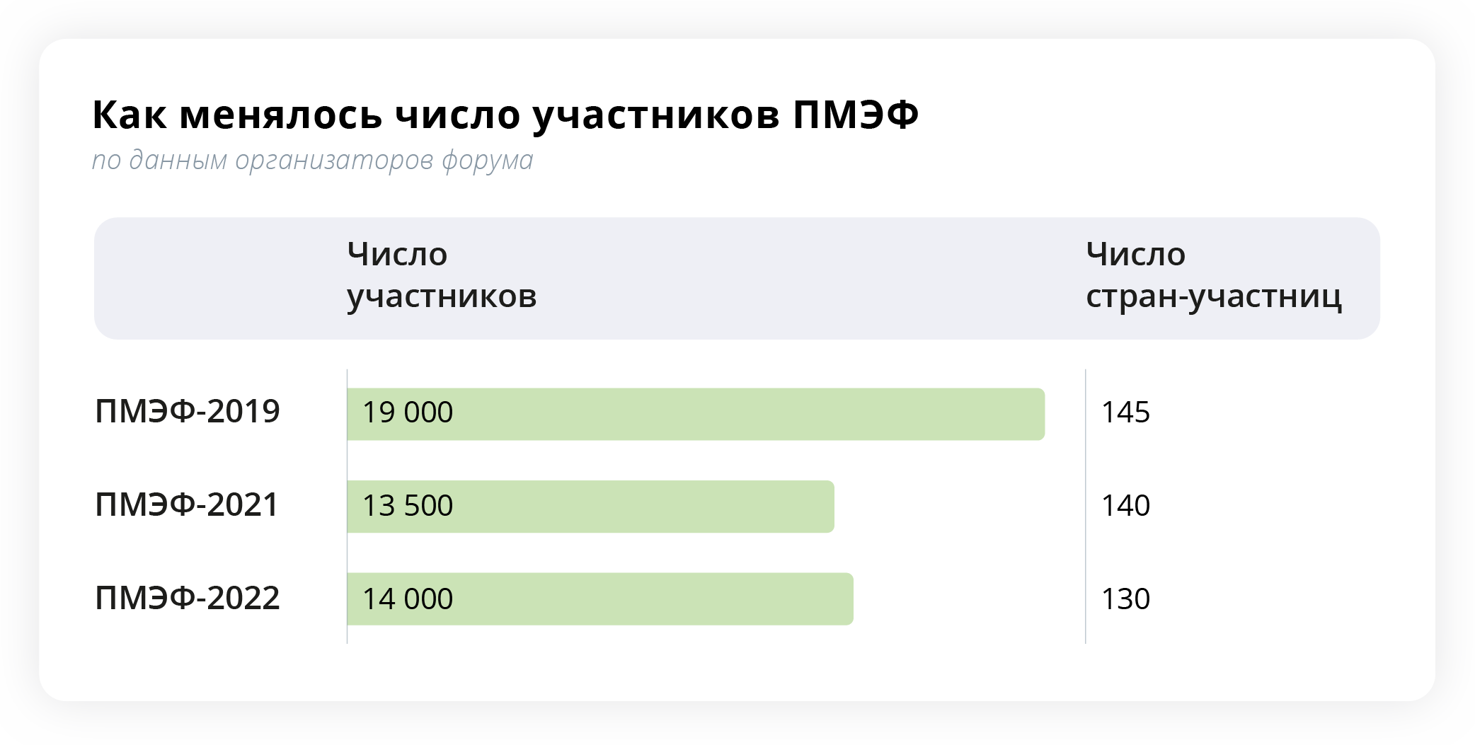 Статистика на сайте форума подтверждает, что уровень международного представительства на ПМЭФ снижается год от года. Например, в 2013 году гостьей форума стала Ангела Меркель, тогдашний канцлер Германии, а в 2017-м в пленарном заседании принял участие индийский премьер Нарендра Моди.