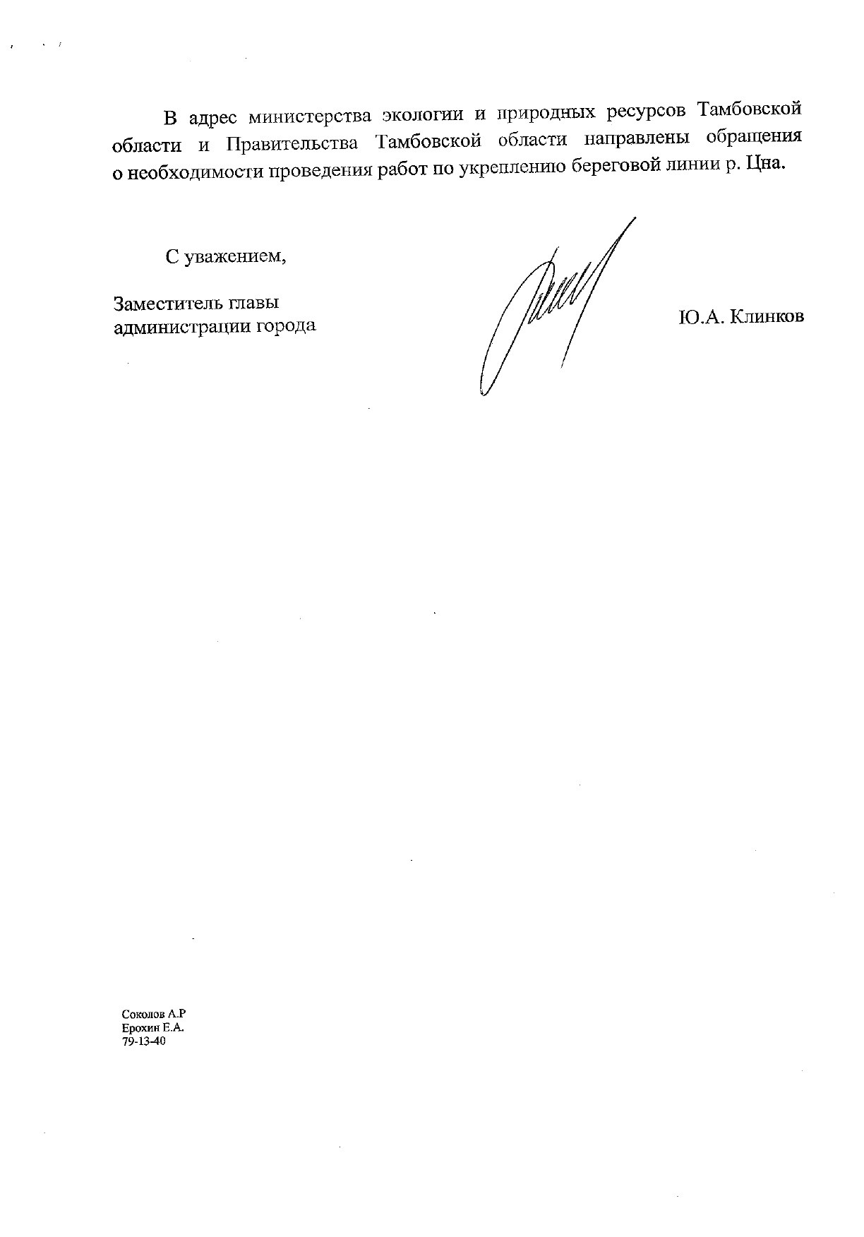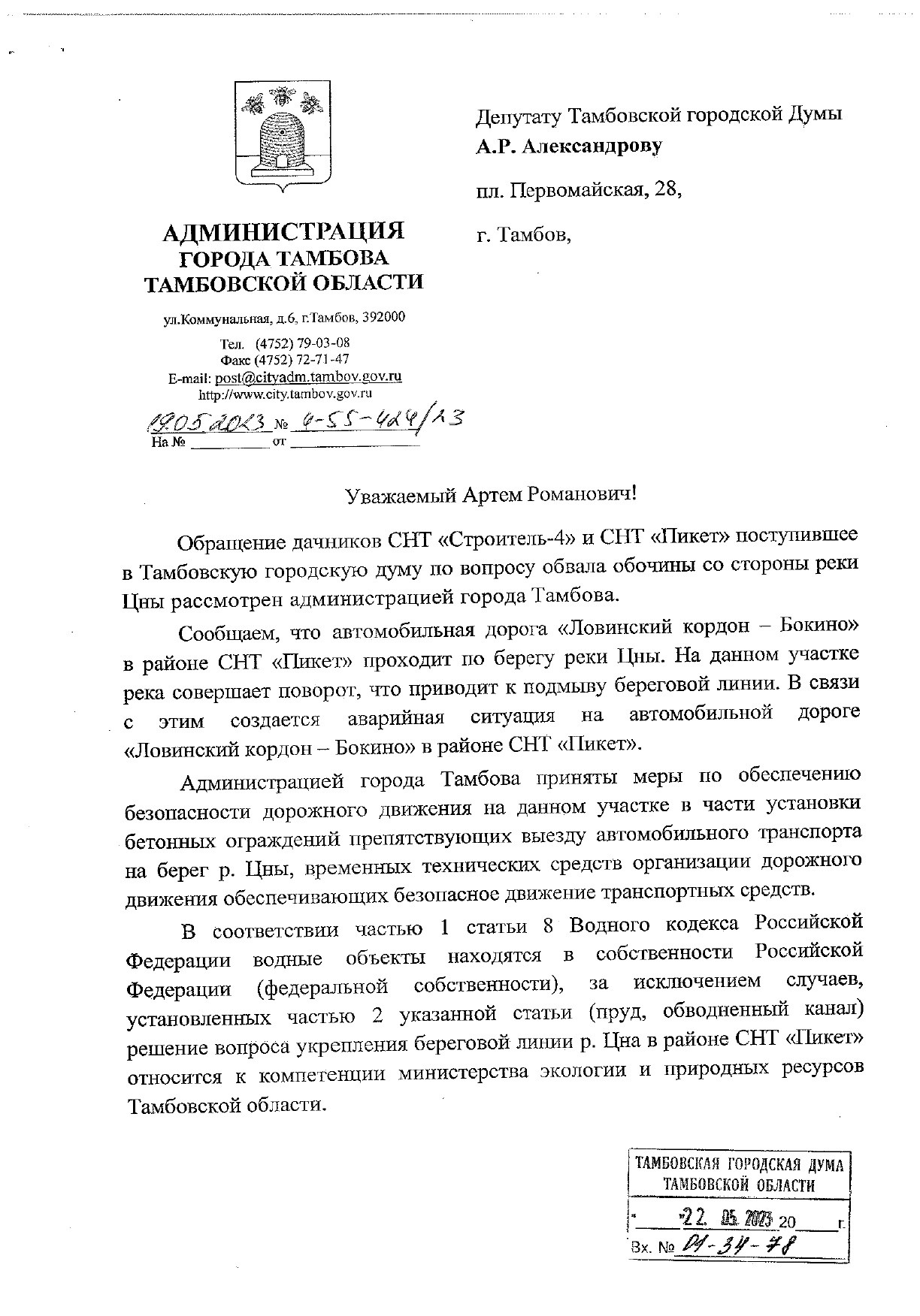 На мой запрос поступил ответ из администрации города. Единственная мера, которую смогла предпринять чиновники, — установка бетонных блоков. Причем изначально блоки были установлены администрацией Тамбовского района. А обращение по проблеме было перенаправлено в областное министерство экологии и природных ресурсов, которое должно заниматься укреплением береговой линии.