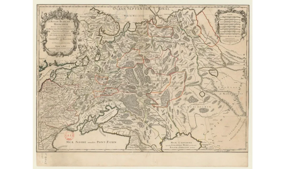 Sanson divides “White Ruthenia, or Muscovy” into “kingdoms, principalities, duchies, provinces, and peoples”, while in reality it was divided into counties and quarters. The map includes the Vorotynsk, Tver, and Yaroslavl principalities which were abolished back in the 15-16th centuries.