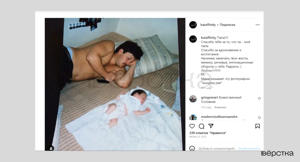 Под совместными фотографиями девушка поздравляла телеведущего с днём рождения, признавалась ему в любви и благодарила за «вдохновение и воспитание». Под одним из постов с совместной фотографией она написала: «Спасибо тебе за то, что ты — мой папа».