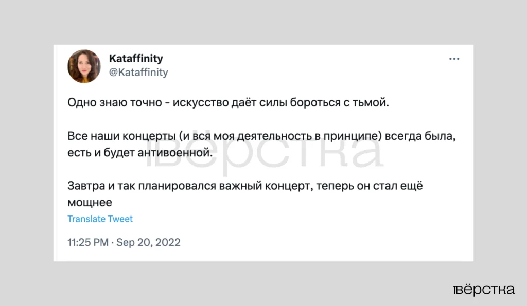 21 сентября, в день объявления мобилизации, Соловьёва анонсировала концерт группы в своём Twitter словами о том, что искусство даёт ей силы бороться с тьмой. «Все наши концерты (и вся моя деятельность в принципе) всегда была, есть и будет антивоенной», — написала она.