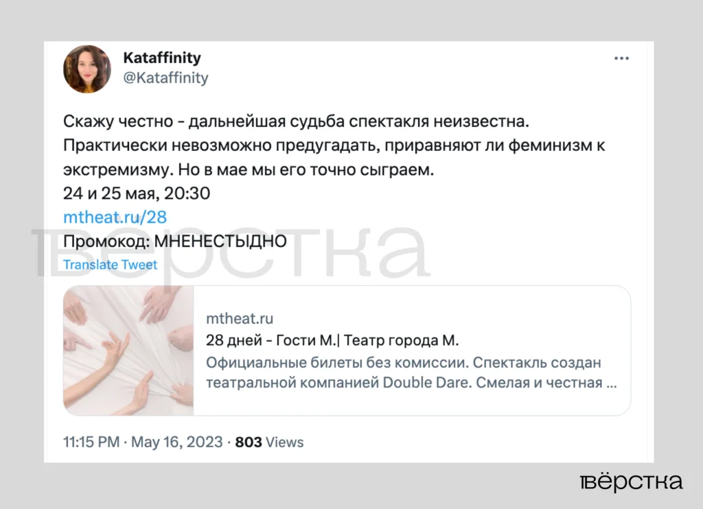Родная дочь телеведущего Владимира Соловьёва Екатерина, как узнала «Вёрстка», весной 2023 года поставила в Москве спектакль «28 дней» по одноименной пьесе драматурга Ольги Шиляевой. Четыре показа уже состоялись на сцене «Театра города М» в апреле и мае. На июль запланированы ещё два показа, но сама Соловьёва не уверена, что они состоятся. В открытом аккаунте Twitter, в котором у нее около 500 подписчиков, Соловьёва написала, что дальнейшая судьба спектакля неизвестна, так как «практически невозможно предугадать, приравняют ли феминизм к экстремизму».
