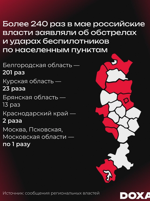 В мае российские власти заявляли об обстрелах и ударах беспилотников по населенным пунктам более 240 раз. Власти Белгородской области сообщали о 201 атаке, Курской — о 23, Брянской области — о 13, Краснодарского края — о двух. По одному удару пришлось на Москву, Подмосковье и Псковскую область.