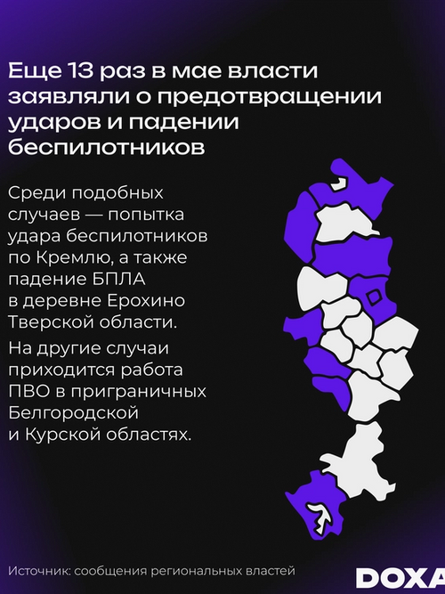 Еще 13 раз в мае власти заявляли о предотвращении ударов и падении беспилотников. Среди подобных случаев — попытка удара беспилотников по Кремлю, а также падение БПЛА в деревне Ерохино Тверской области. На другие случаи приходится работа ПВО в приграничных Белгородской и Курской областях.