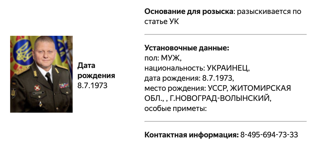 Россия объявила в розыск главнокомандующего Вооруженных сил Украины Валерия Залужного. Данные об этом «Медиазона» обнаружила в базе розыска МВД.