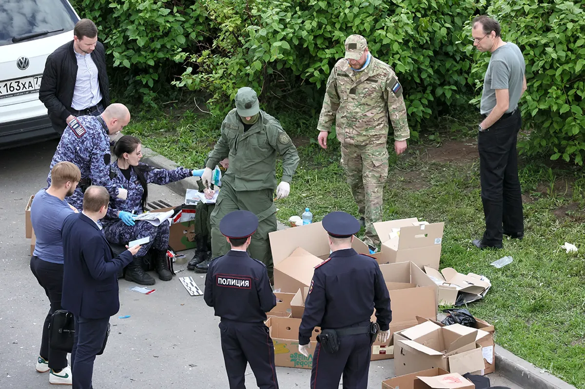Автобусом от метро «Саларьево» до поселка Московский — минут семь без пробок. Мы так и едем, но резко встаем прямо перед поворотом на Атласова. Перед автобусом — несколько машин пытаются разъехаться, развернуться: территория к соседним с местом происшествия жилым домам закрыта лентой, туда ни заехать, ни пройти. На траве за лентой лежит какая-то коробка с обломками, которые охраняют дежурящие рядом сотрудники полиции.